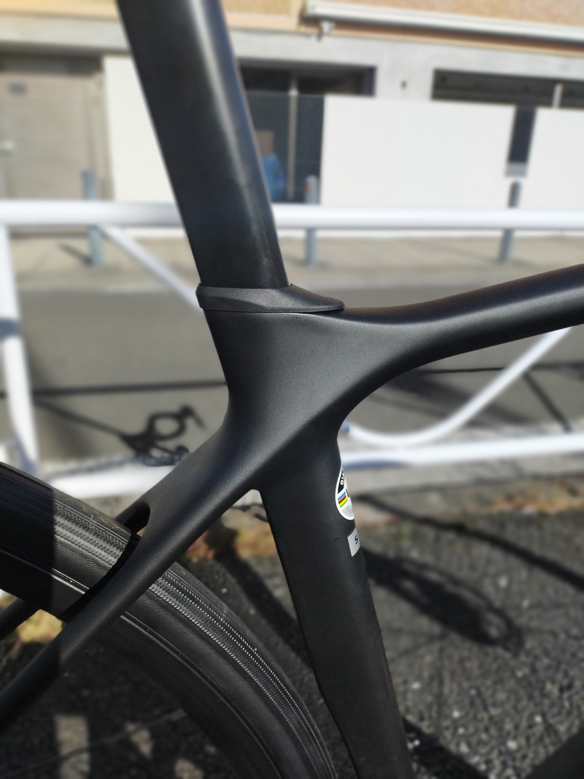新世代TCRには、随所に空気抵抗を軽減させる工夫が凝らされており、例えば、フロントフォークとシートポストの後部は垂直に切り立っています。
