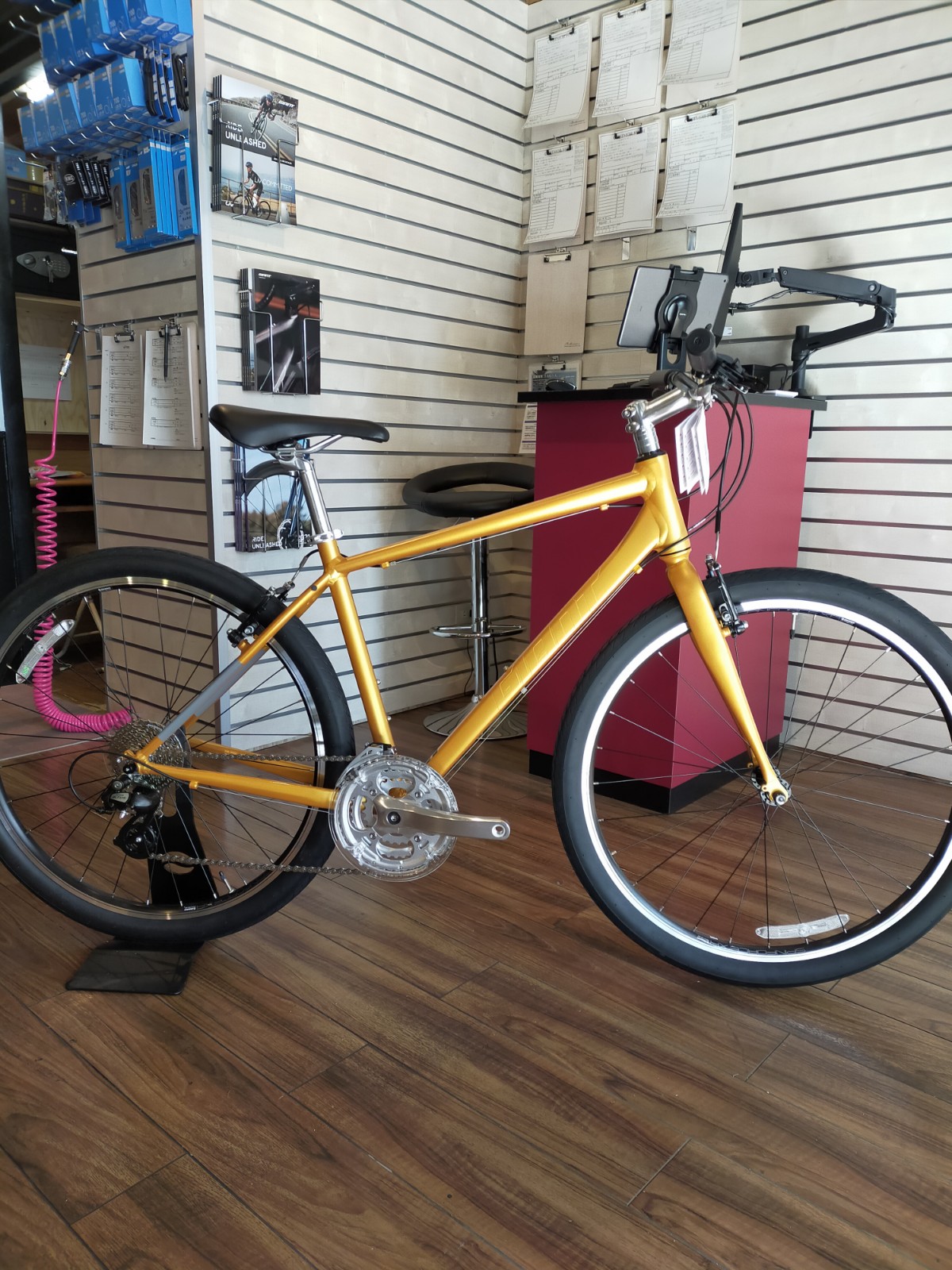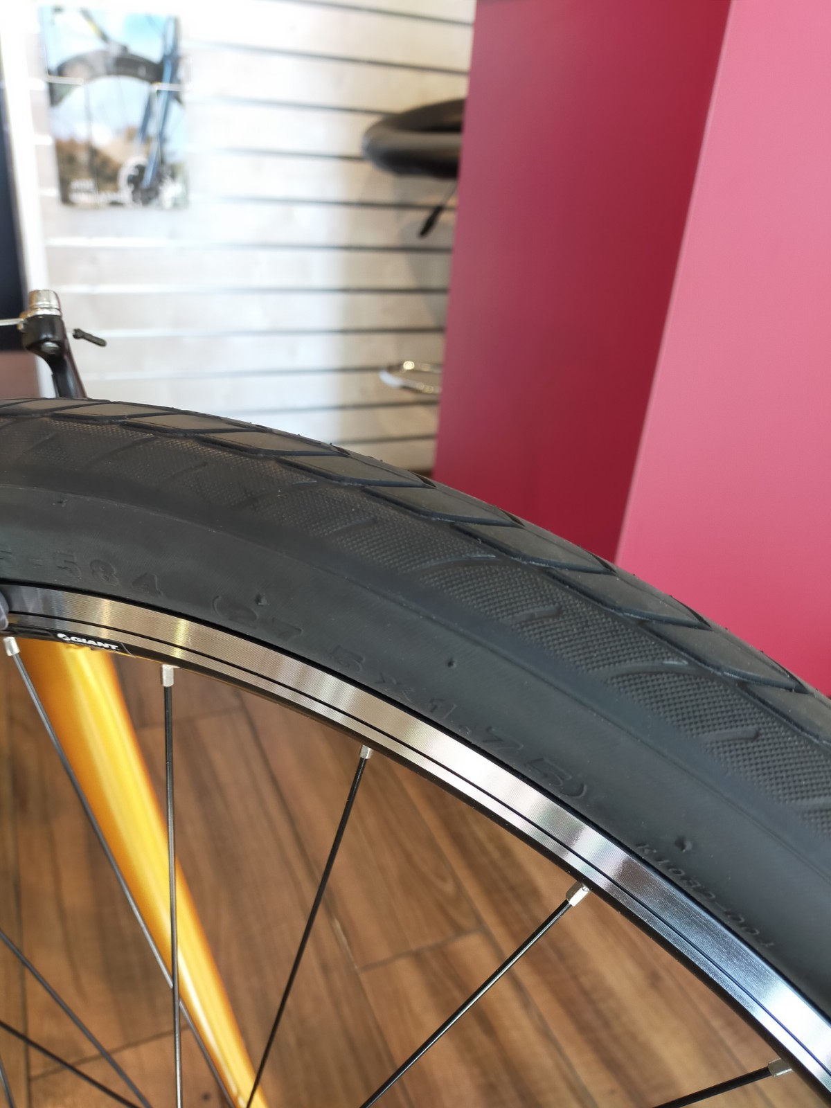 一般的なクロスバイクと比べて、敢えて小さめなホイールにすることで、太いタイヤを履いたときの全体の車輪径を他のクロスバイクとほぼ同じ大きさにしています。