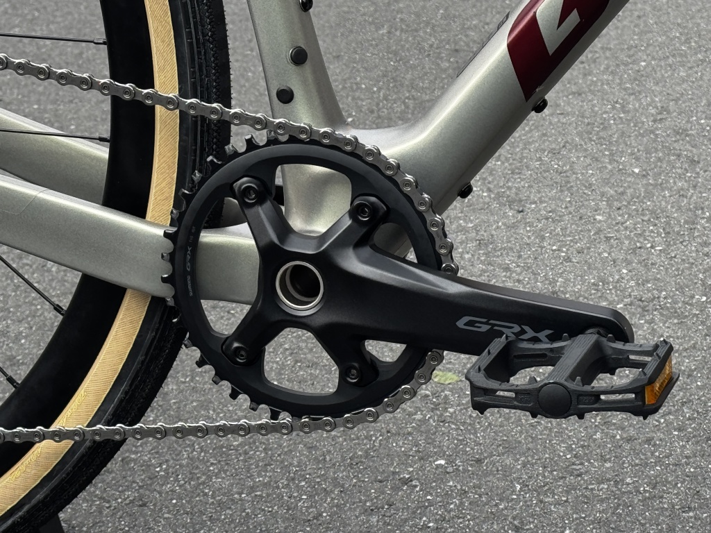 完成車だとサードパーティーだったクランクはGRX純正をチョイス。街乗りからグラベルに適応したちょうどいい40Tになっています。