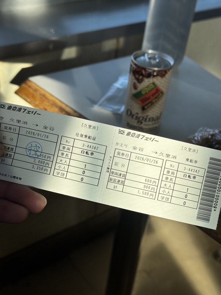 車両運賃とあわせて往復で3350円。車よりもはるかに安い金額です。ちなみに久里浜港の駐車場は1000円なので、無理に自走しなくてもいけます。