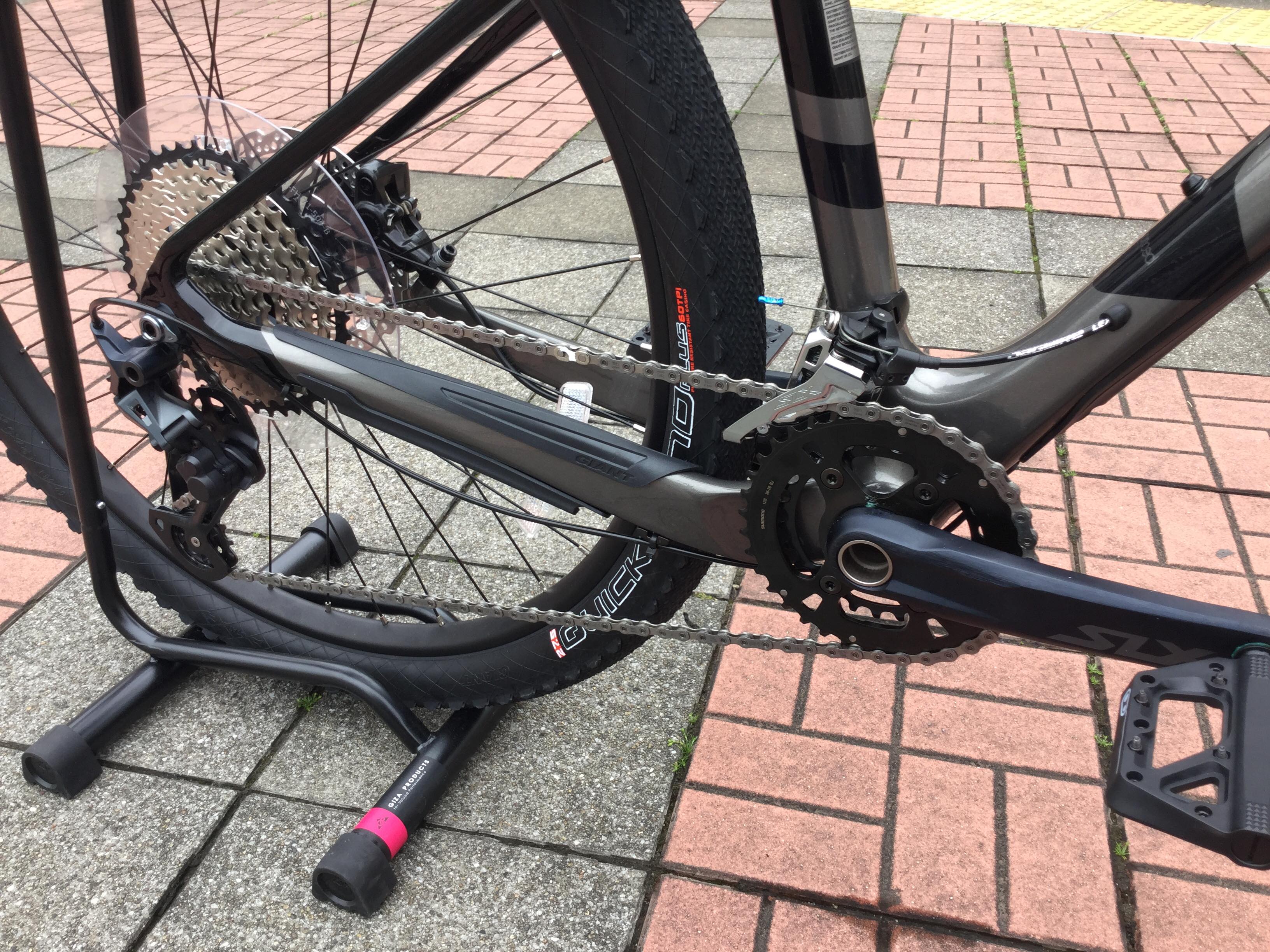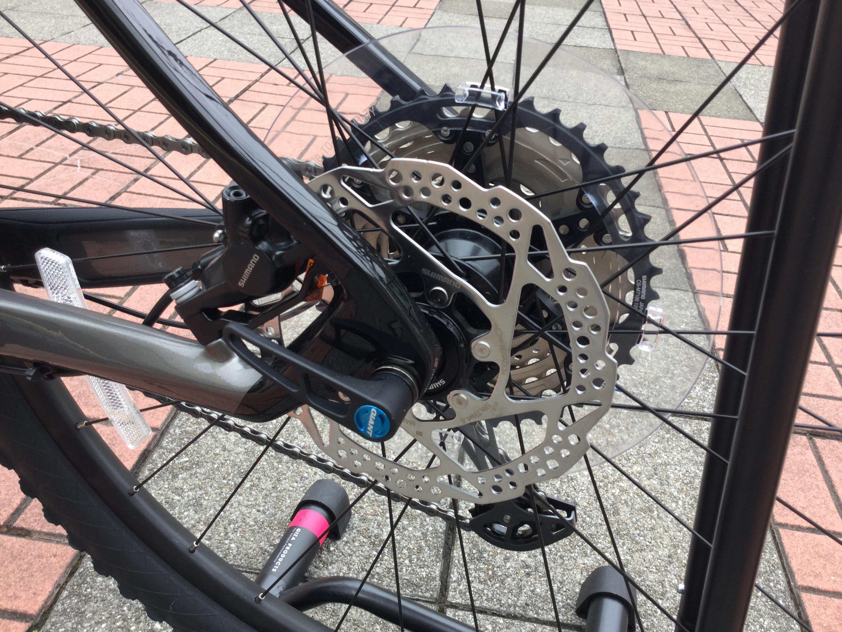 コンポーネントは最新のSLX( M7100系 )を採用。リアスプロケットは10-45T。フロントギアはダブル。シングルギアがポピュラーとなっている今、ダブルギアを否定するかというとそうでもなく、スタッフKがたまに走りに行く山では、フロント32T リアロー側46Tだと足りないときが…足が足りないからだ!と言われそうではありますが、趣味幅を広げれば未だにダブルもありかなと思います。