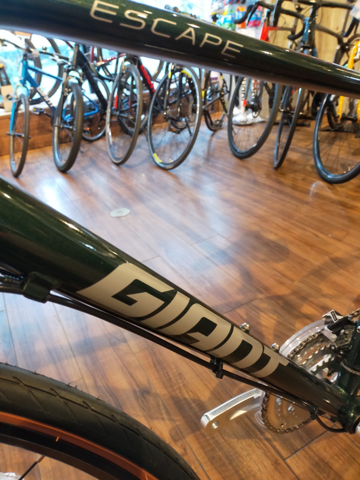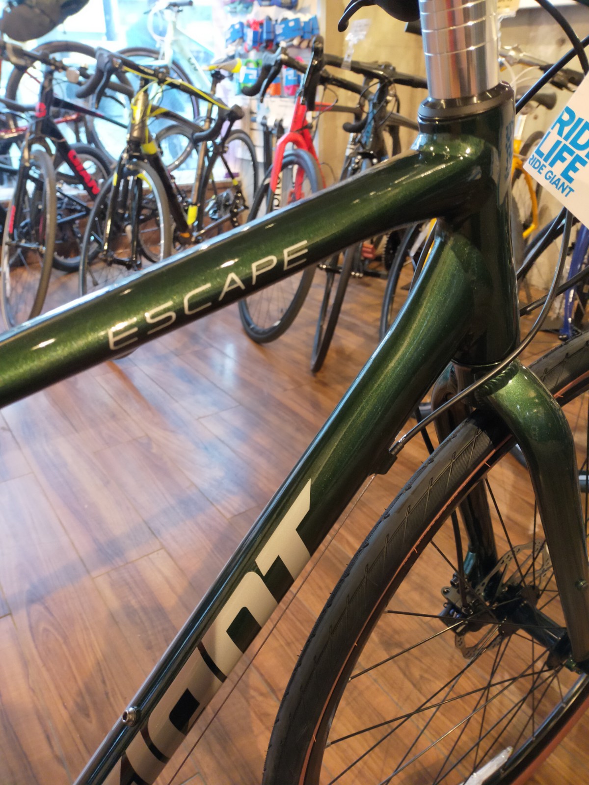 本日は、シックな色合いが魅力的なクロスバイク、GIANT ESCAPE (ジャイアント エスケープ) R DICS フォレストグリーン ¥61,000(税抜)をご紹介します。
