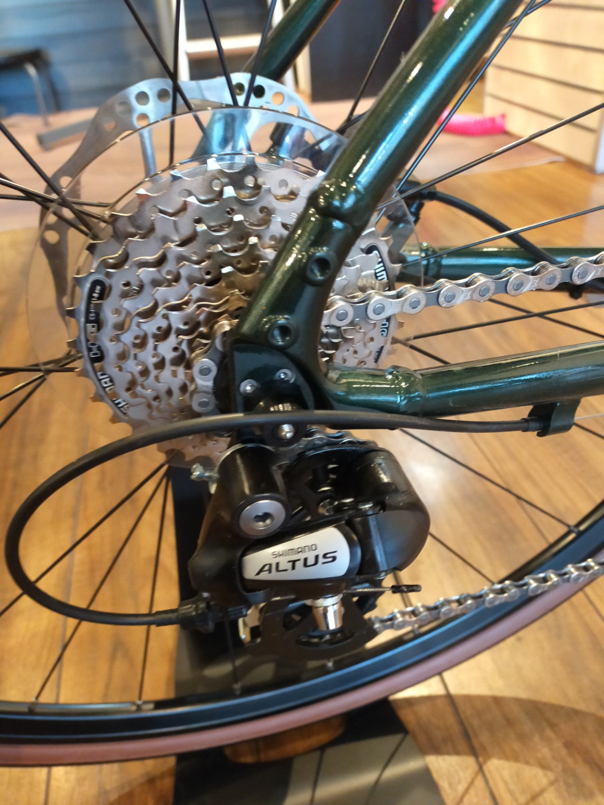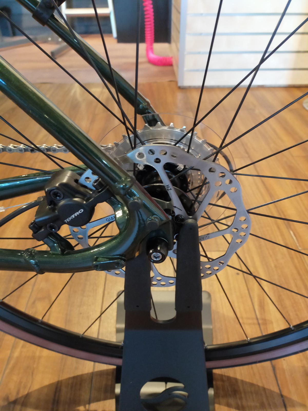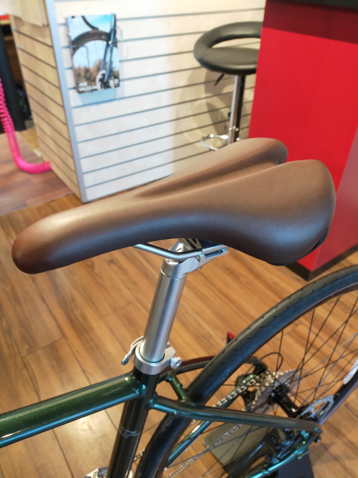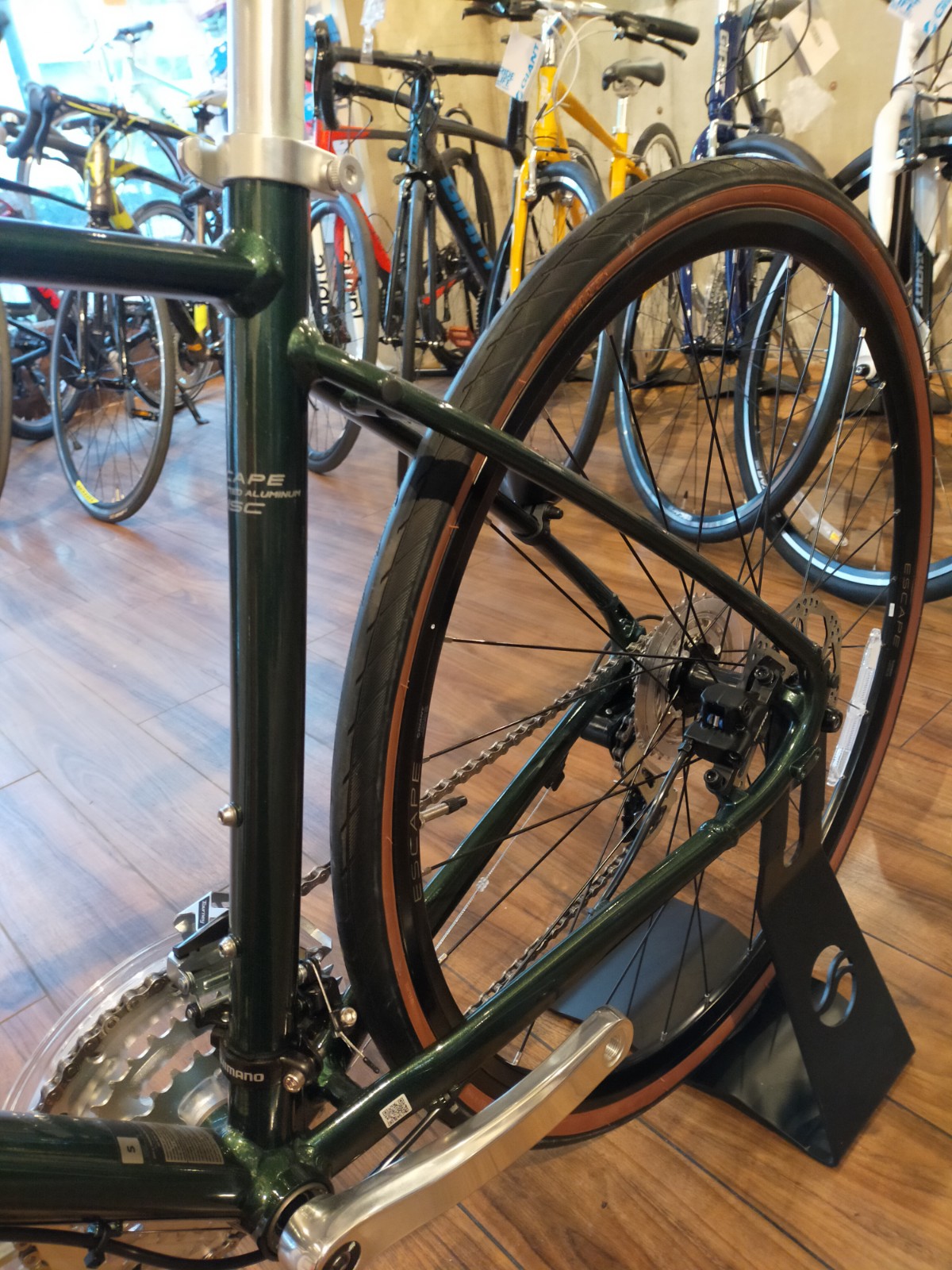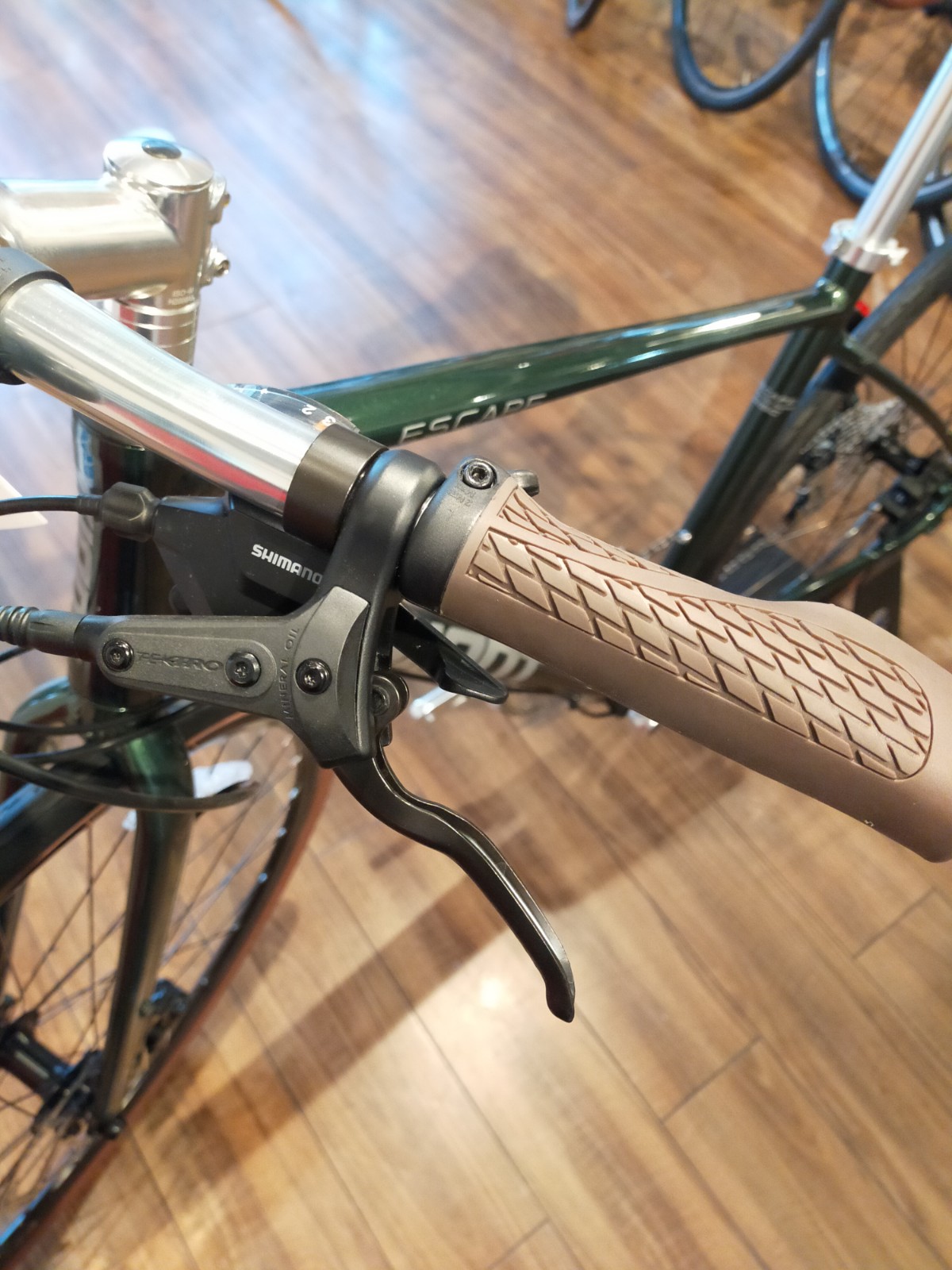 フレームのフォレストグリーンに調和するように、グリップ、サドル、タイヤサイドをブラウンにしています。