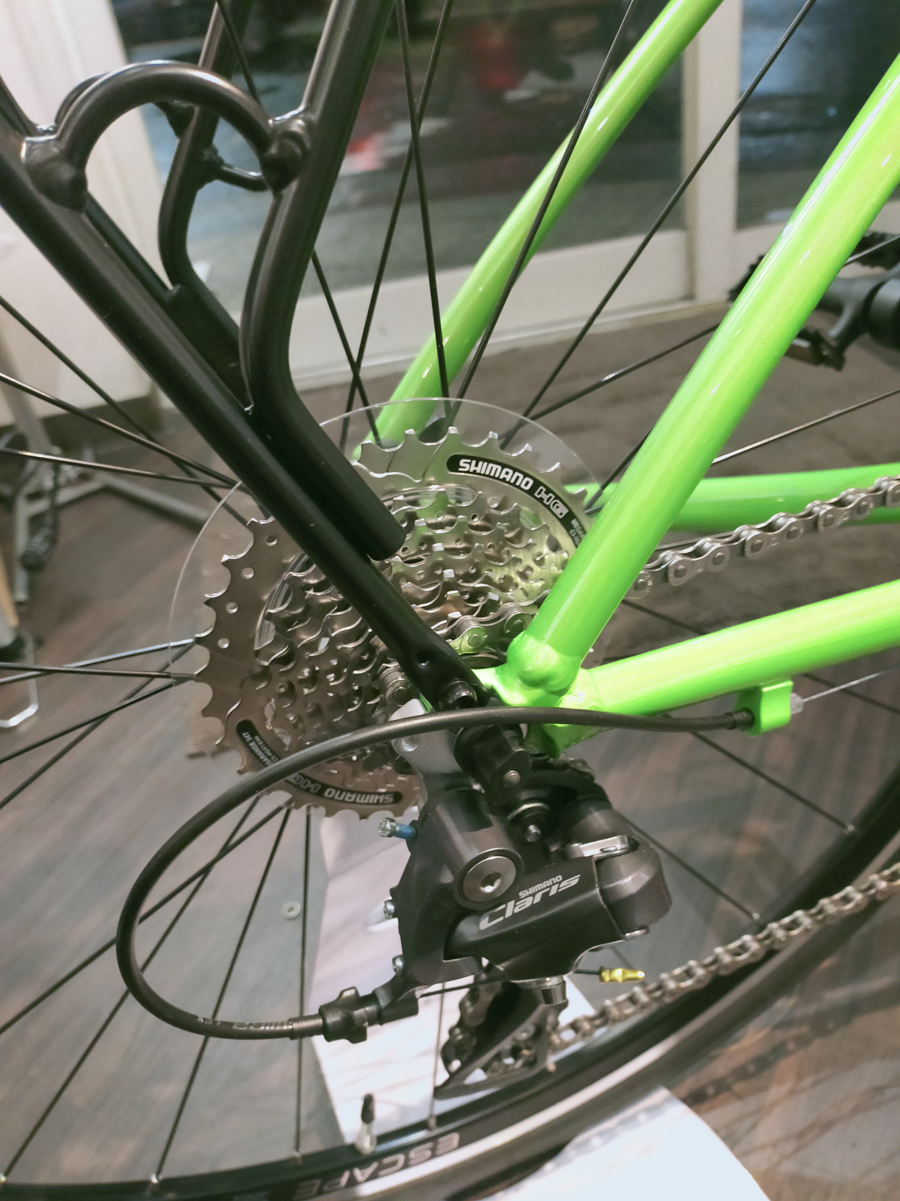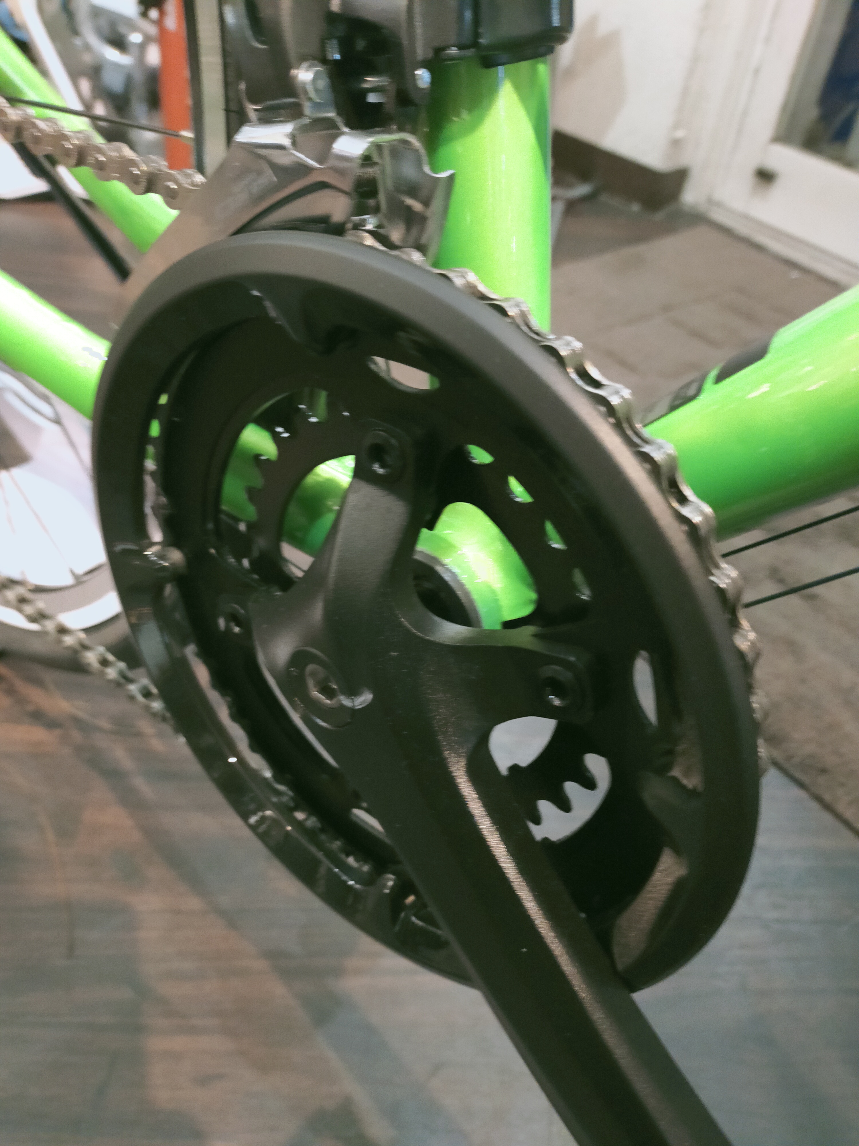 最大のギア比は、フロント46T、リア11T、4.18で、時速40kmくらいであれば十分にカバーできるでしょう。