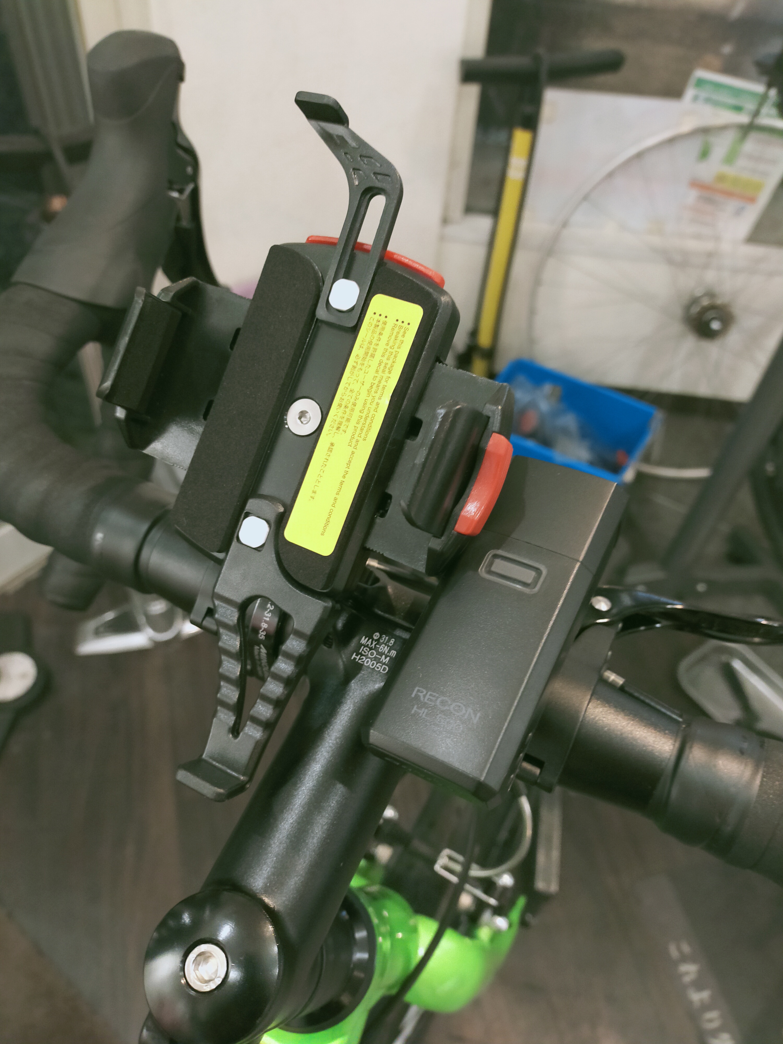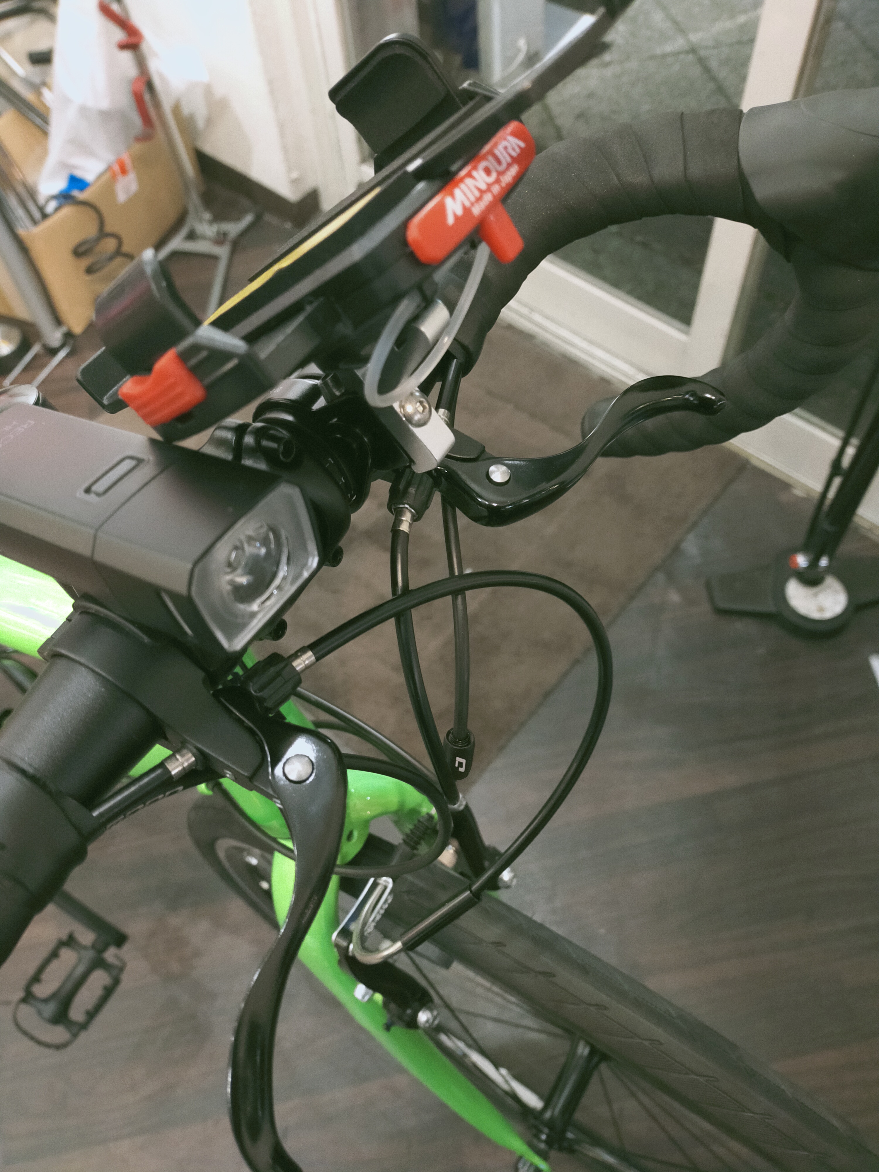 フロントライト、リアライト、スマートフォンフォルダを装着しています。