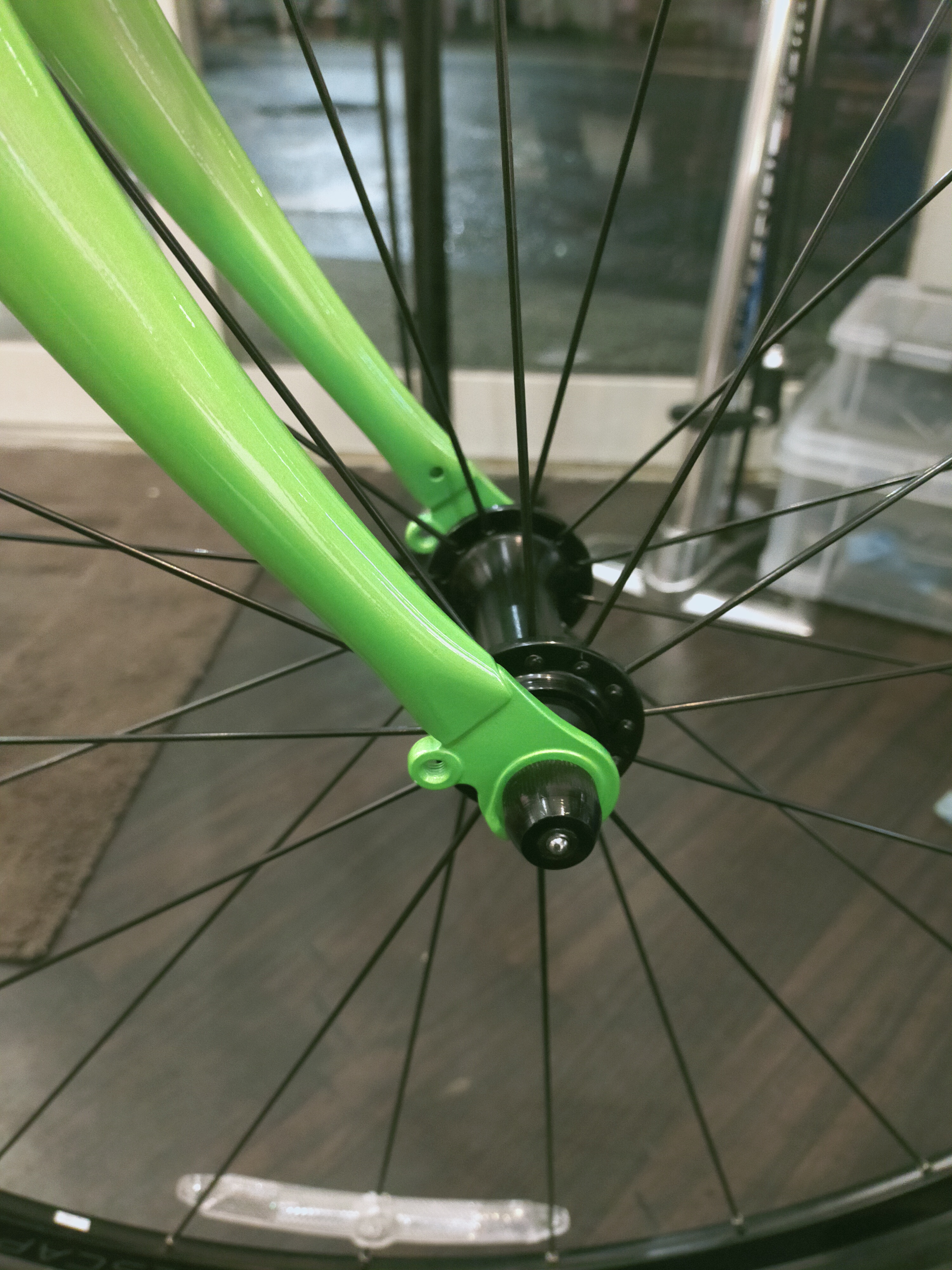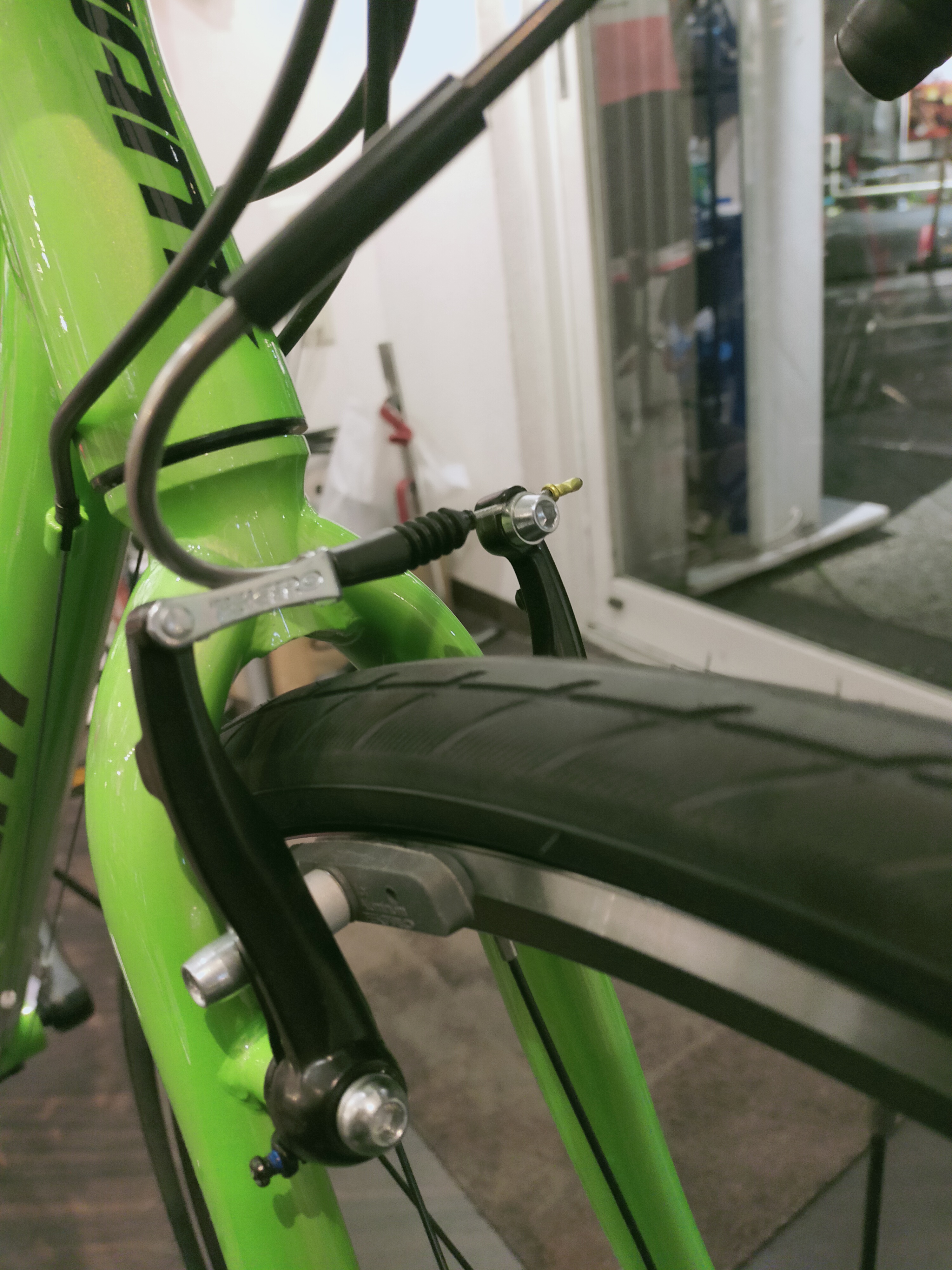 ミニVブレーキにしてある利点としては、キャリパーブレーキよりも制動力が高いこと、輪行時にタイヤを外しやすいこと、などが挙げられます。
