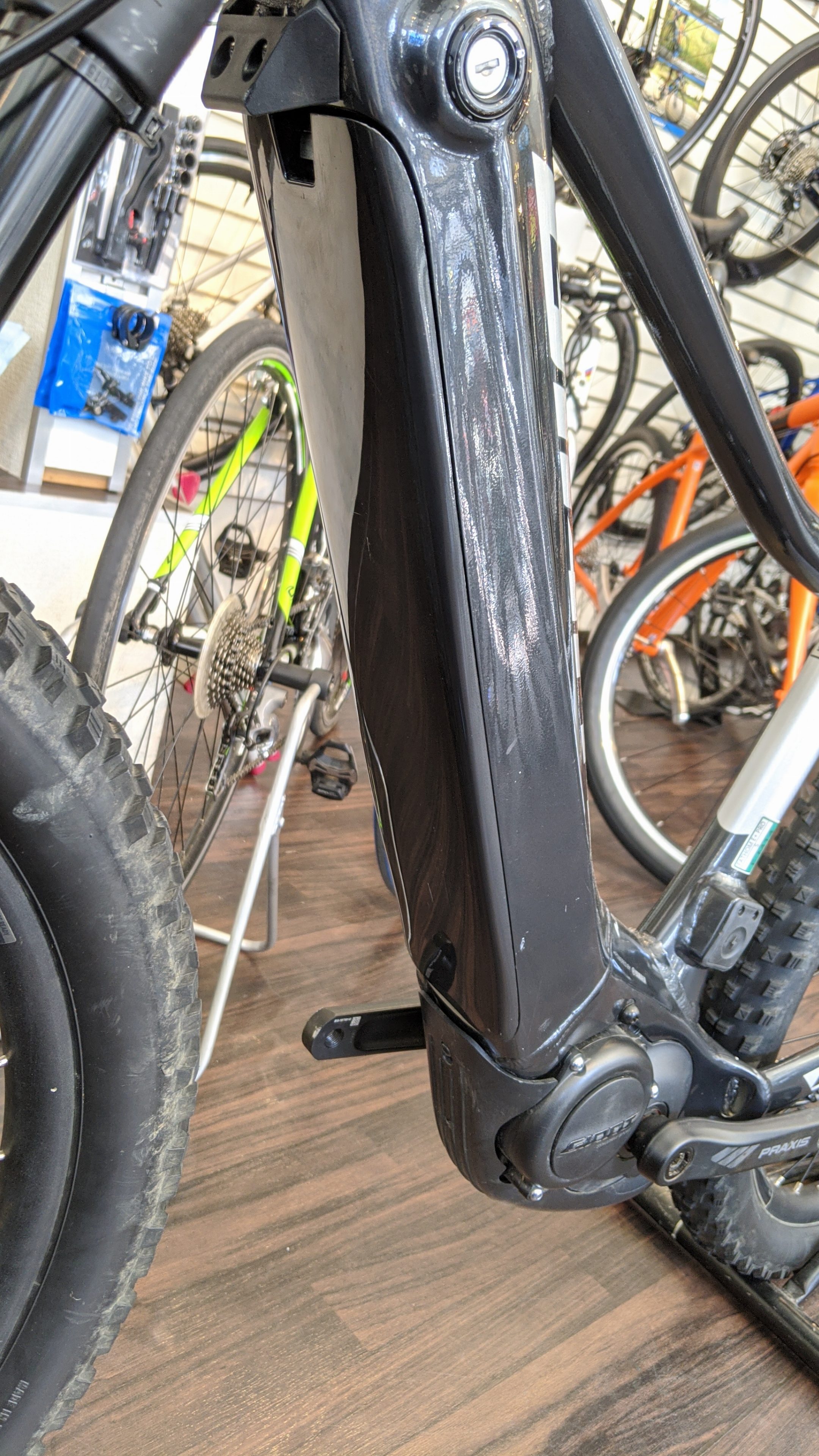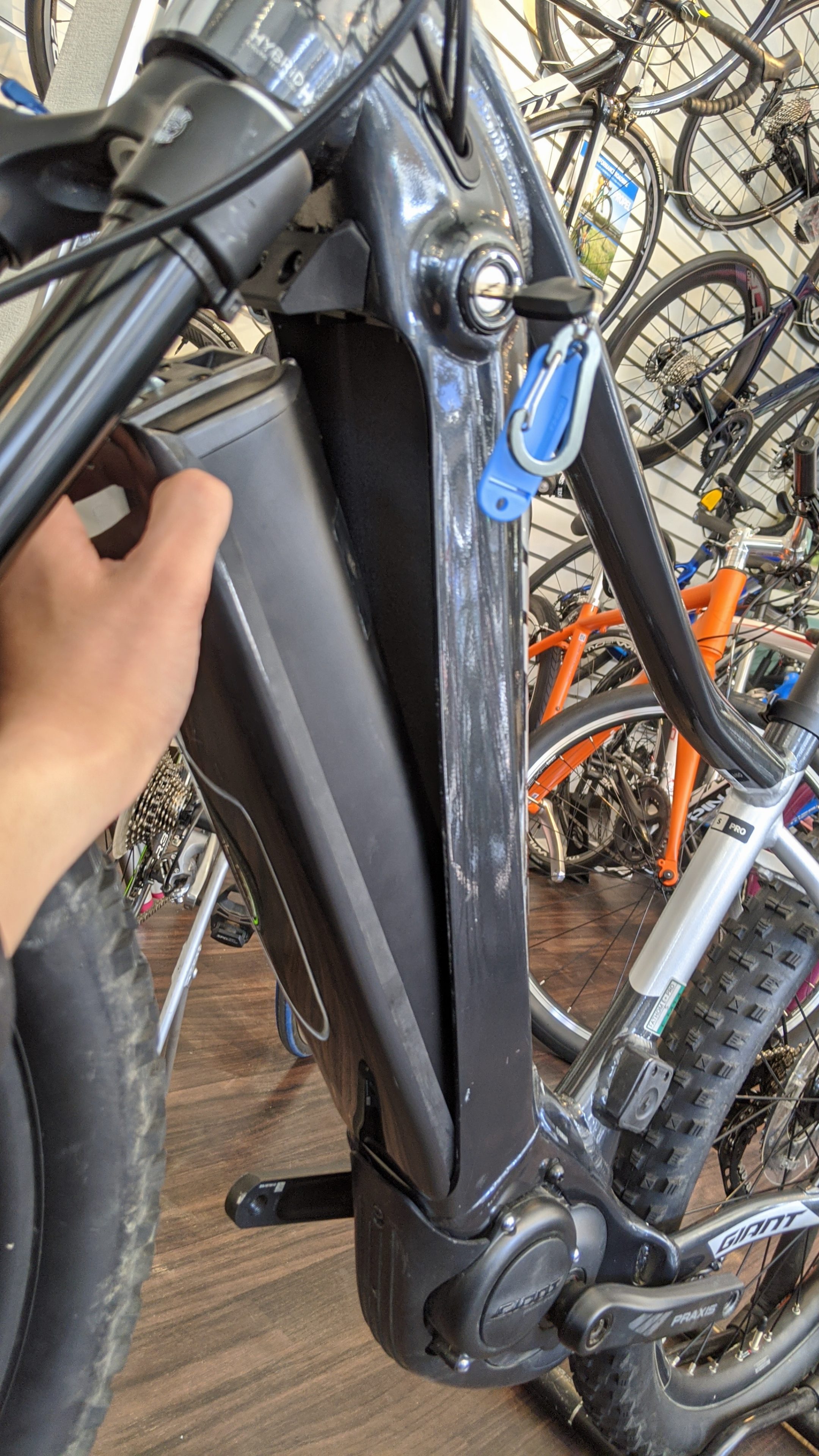 バッテリーの形状はTRANCE E+ PRO同様にダウンチューブ内側に収まる形状になっており、フレーム裏側から取り外しできるようになっています。