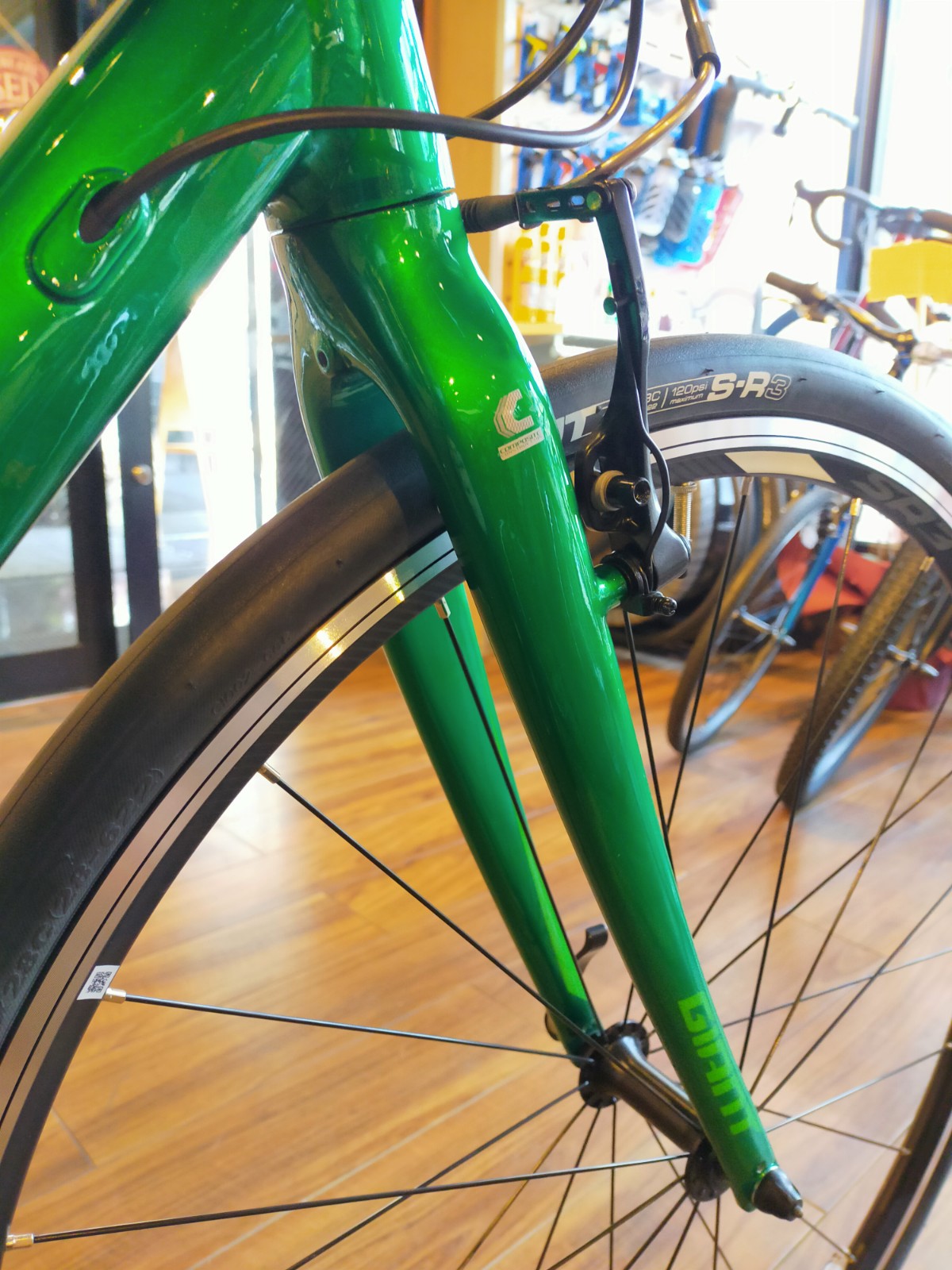 カーボンフォークの本質的なことではありませんが、カーボンの場合、溶接をするわけではないため、フロントフォークがなで肩になります。