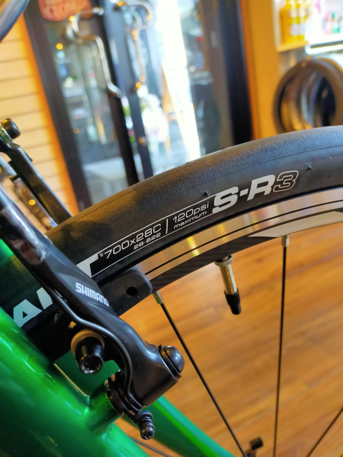 転がり抵抗とグリップ力の良い、28Cタイヤを履いています。