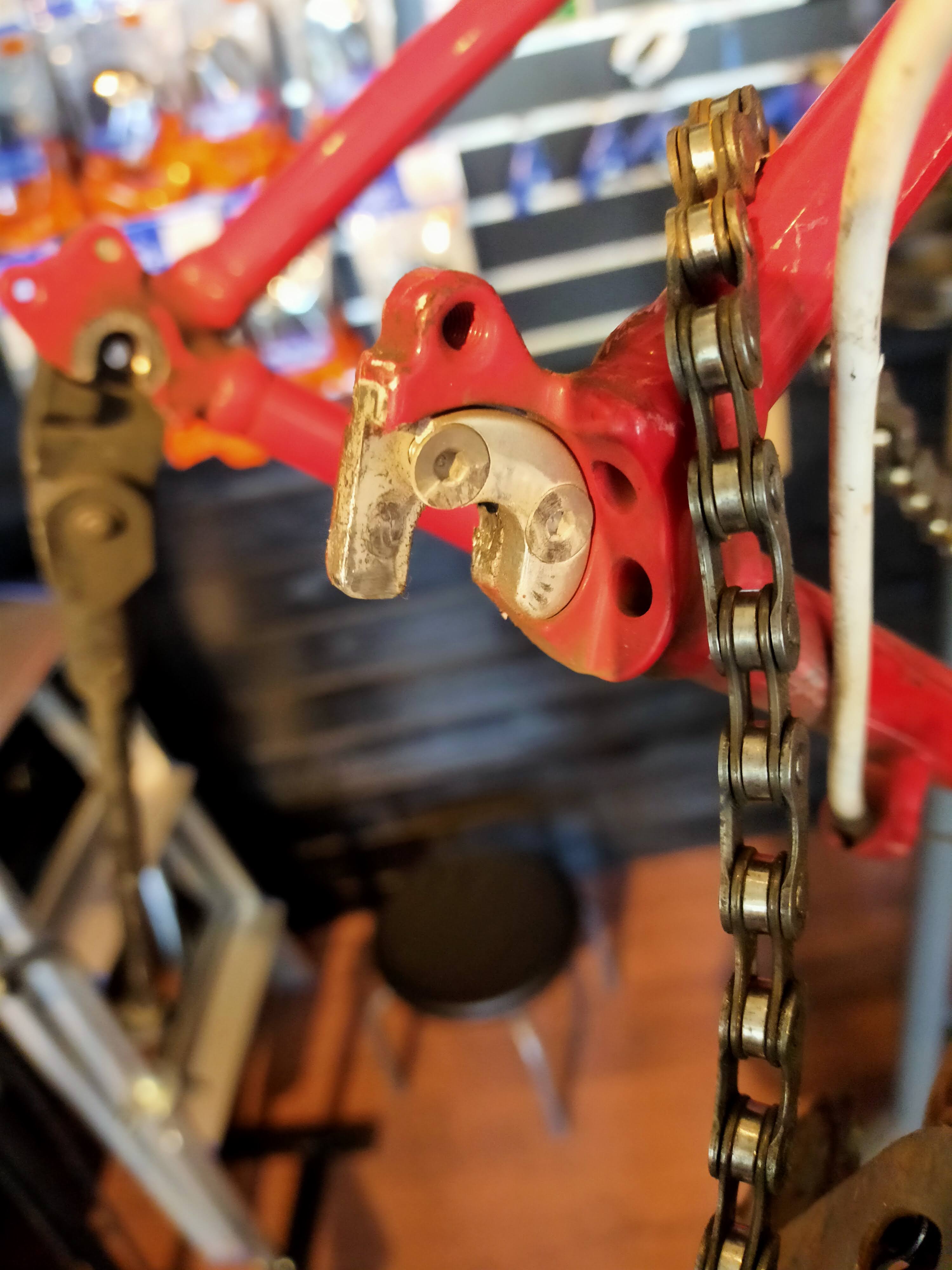 (今回は見事にディレイラーハンガーが役割を果たしてくれて、ダメージのすべてを引き受けてくれましたが、ディレイラーハンガーがダメージを吸収しきれず、チェーンがひしゃげる、ディレイラーが歪む、という場合もございます。)
