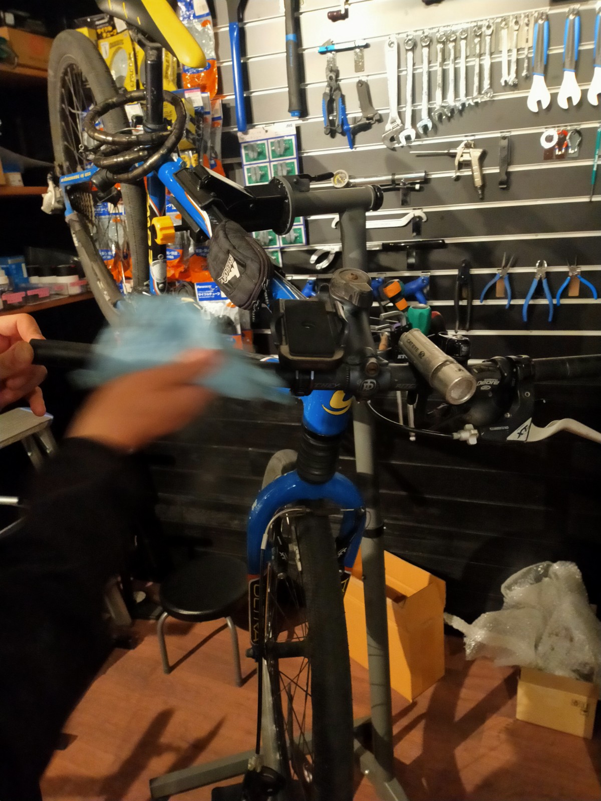 フレームを傷めないように、ハンマーを使って、BB用の工具をはめ込んでいきます。