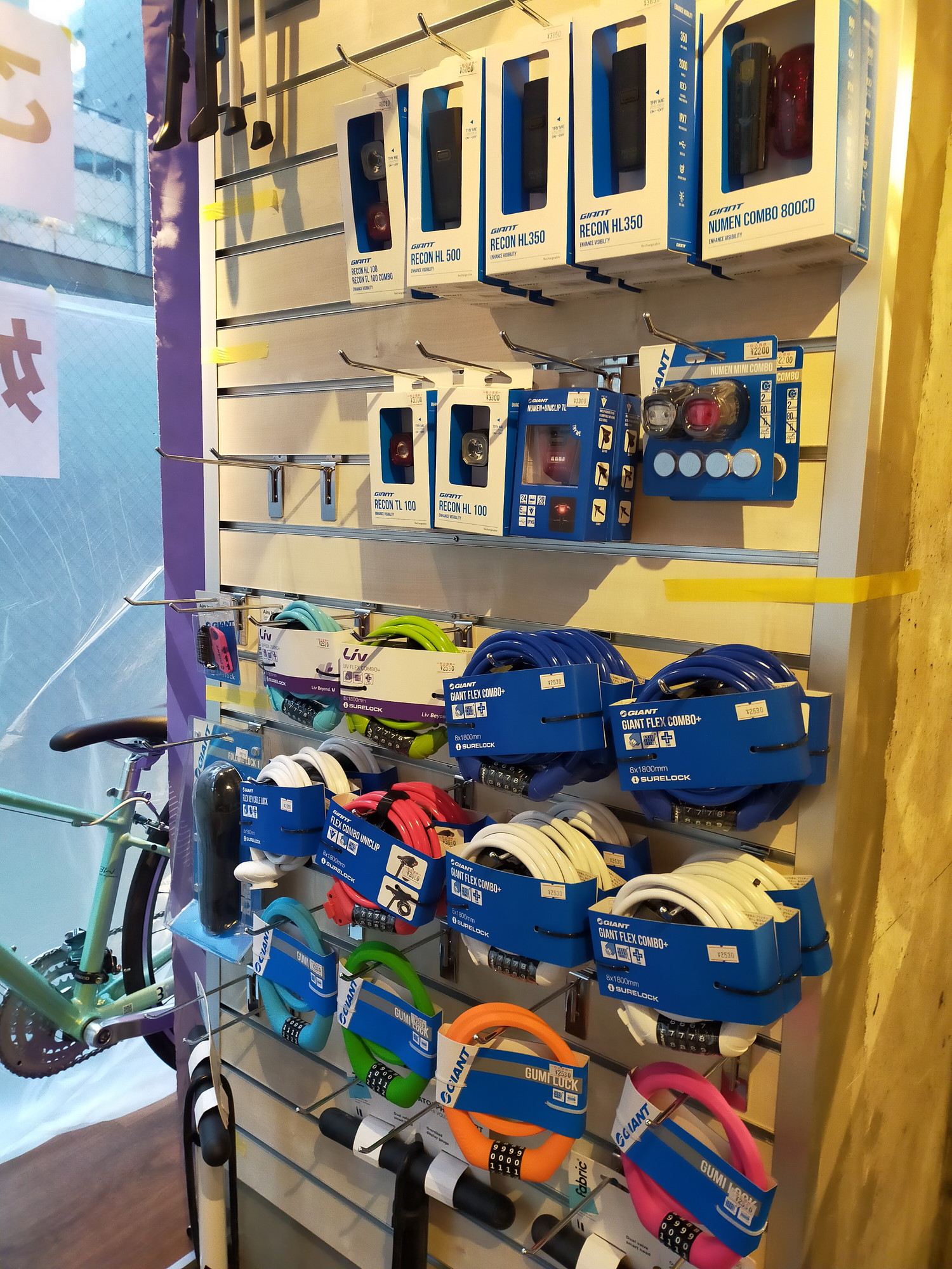 GIANTのライト、ロック、フェンダーなどが並びます。