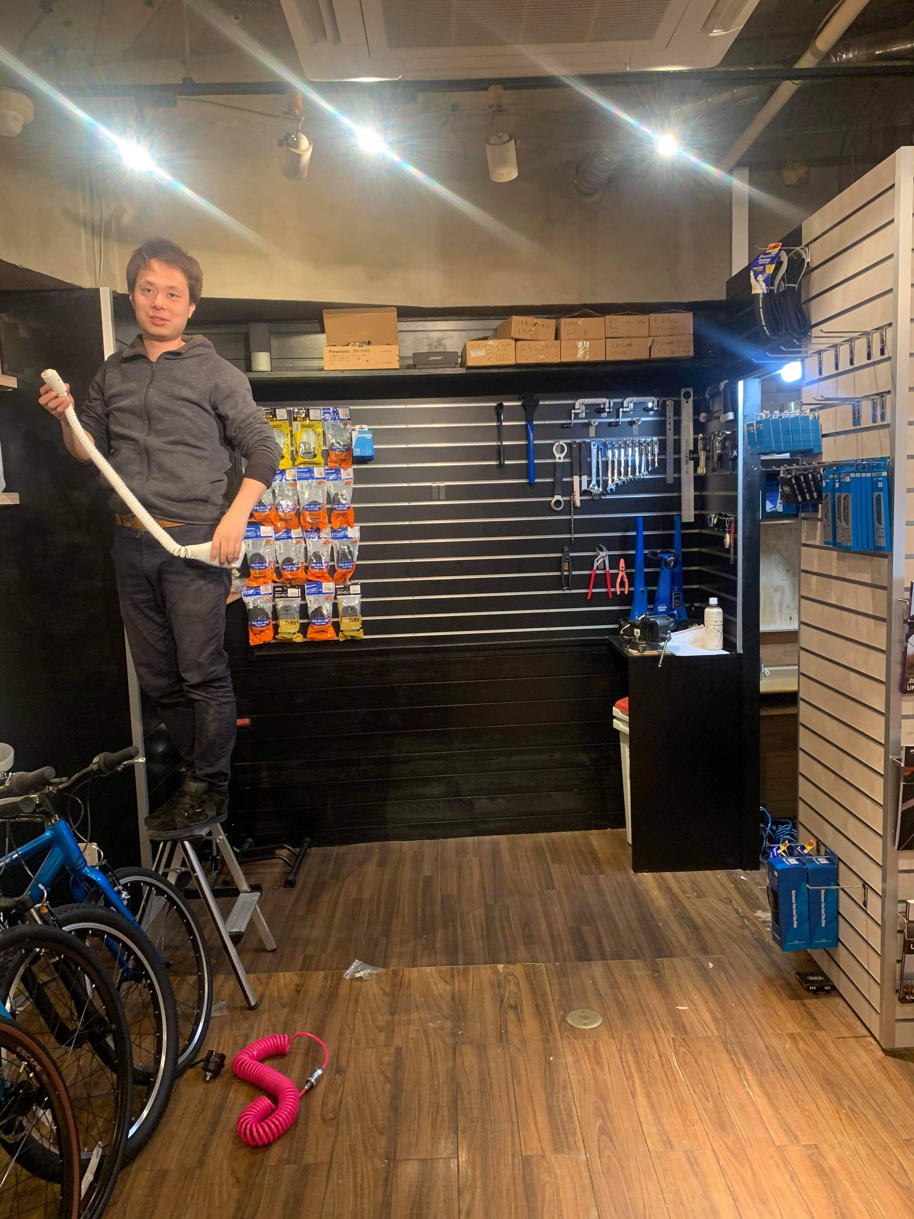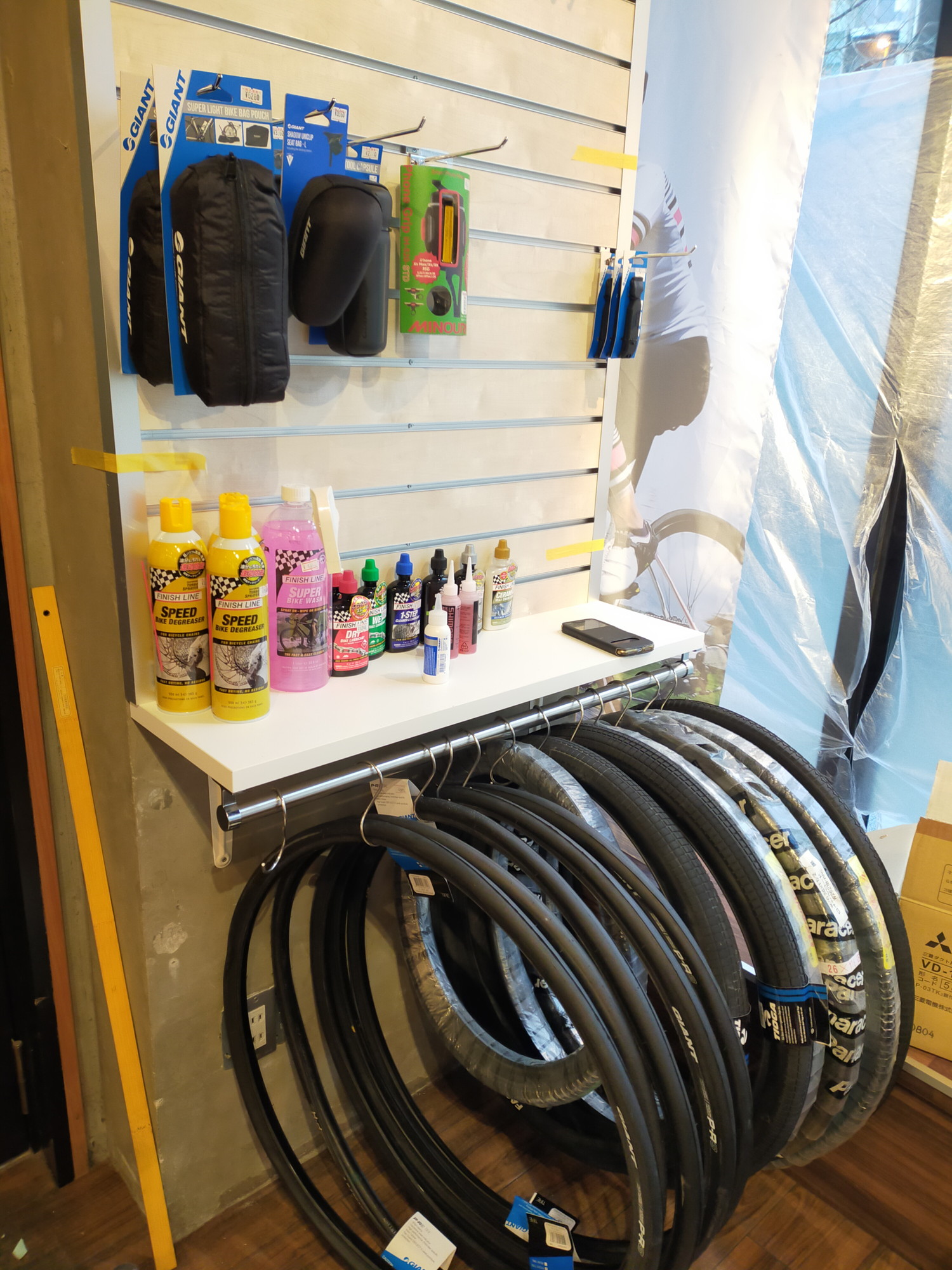 輪行袋、メンテナンス用ケミカル類、タイヤなど。
