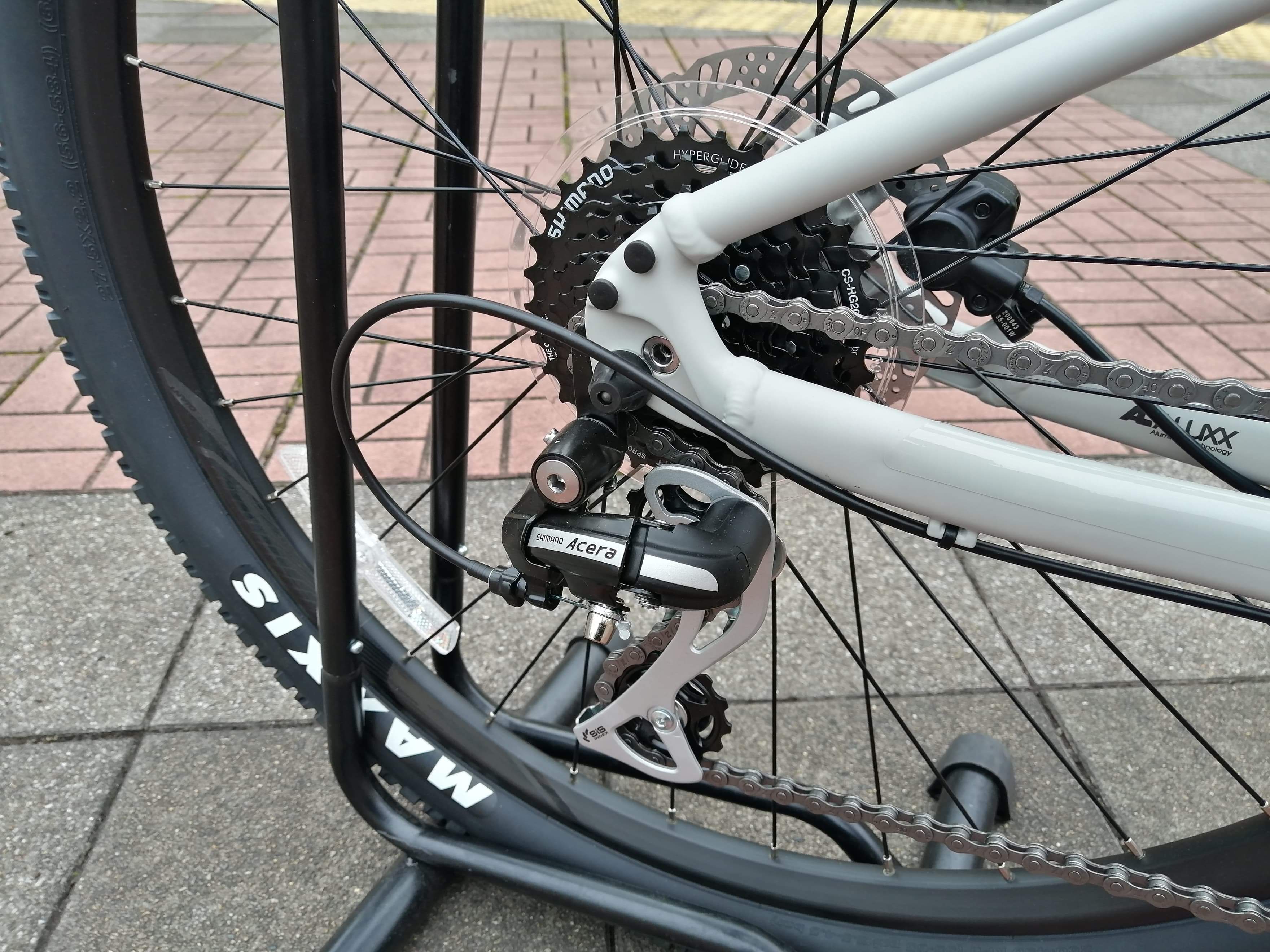 フロントギア2段変速、リア側8段変速。普段使いには十分なスペックですが、フレームが本格的だけあって今後のカスタマイズも楽しめるかも…。(カスタマイズは、ご相談くださいませ。)