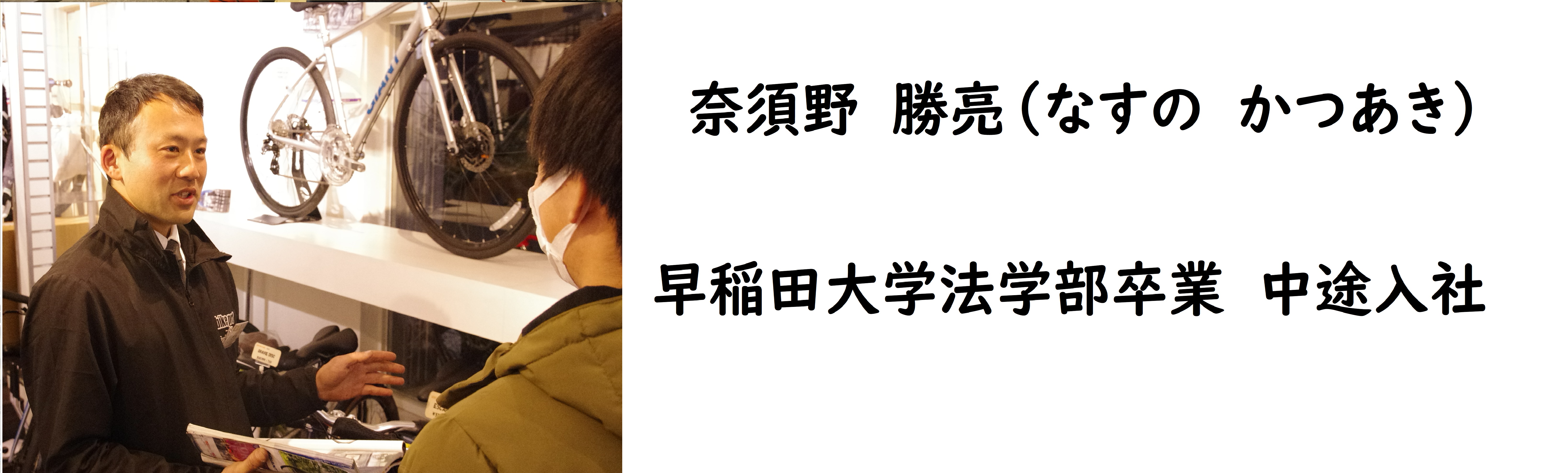 私がこのお店でとても良いな、と思うところは、「自転車を売るだけが目的ではなく自転車を楽しんでいただくためにお客様それぞれにに合った車体やカスタマイズをご提案する」と言う考えが社内で共有されている点です。これはまさに私が自転車を提案する上で1番大事だと思っていた事でした。私もこの考えを常に持ち、これからも自転車のある楽しいライフスタイルをご提案し続けていきたいなと思います。」