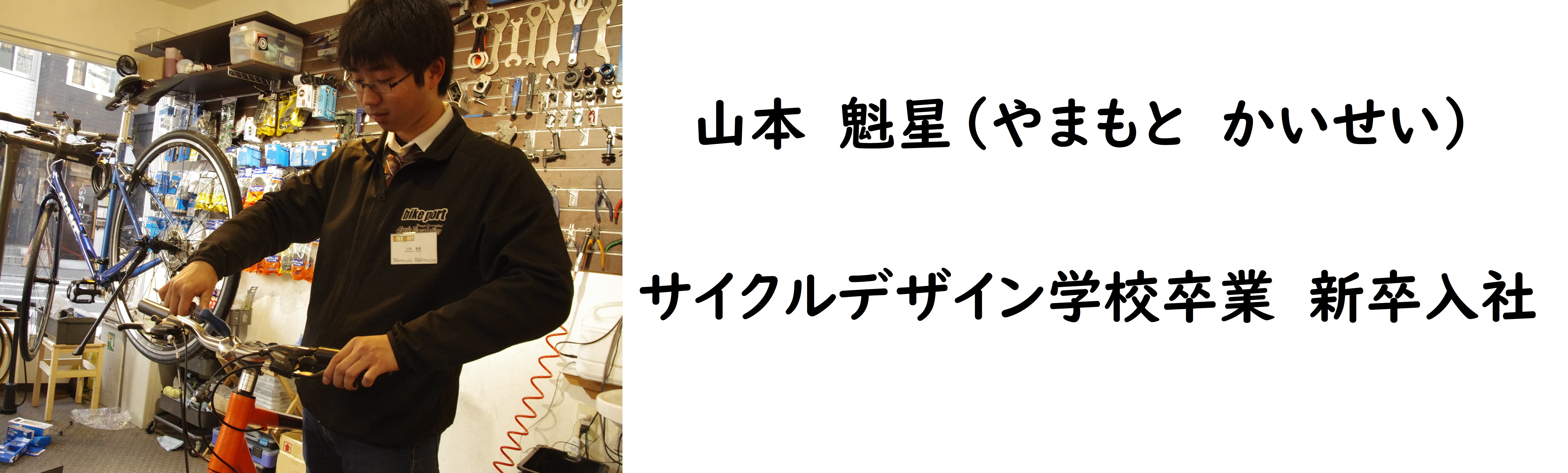「私は自転車の専門学校、東京サイクルデザイン専門学校を卒業し、このbikeportで働き始めました。専門学校で学んだ知識や技術を活かし、車体のご案内やカスタマイズのご提案をしています。…とはいえ学校とお店では勝手が違う事もあり、特に当店ではメーカー、ジャンル問わず様々なバイクの修理やカスタマイズを受け付けておりますので、日々勉強です。そんな私も働き始めて2年目に突入し、有難いことに私を指名して作業依頼をして下さるお客様がいらっしゃり、そういった期待やお褒めのお言葉が大変嬉しく、今の私の大きなやりがいとなっています。