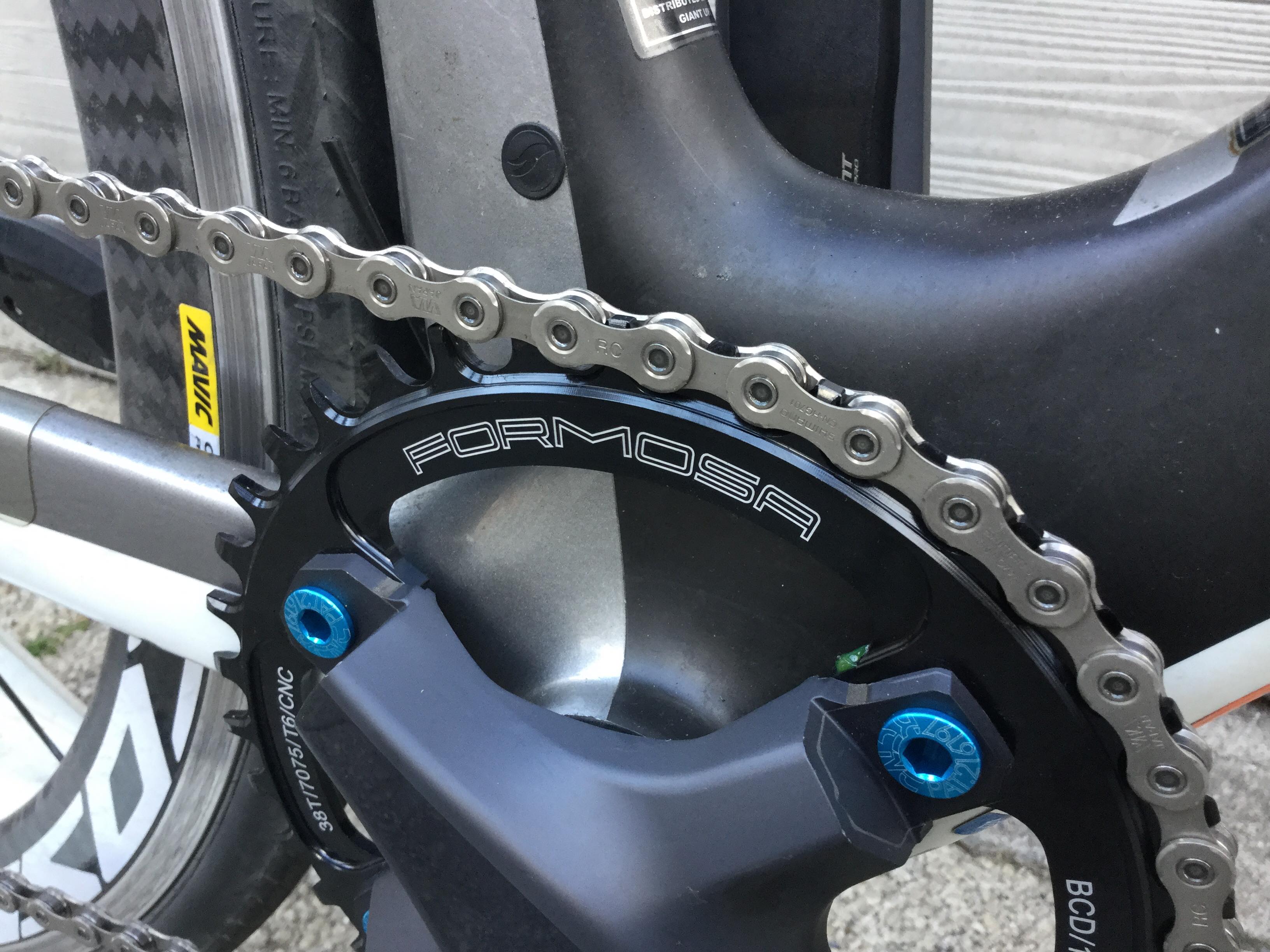 今回はコンポーネント載せ換えが主な作業内容でしたが、フロントシングルギアも面白いのと普段重いギアを使用しないとの事で、38Tの軽めのナローワイドチェーンリングを