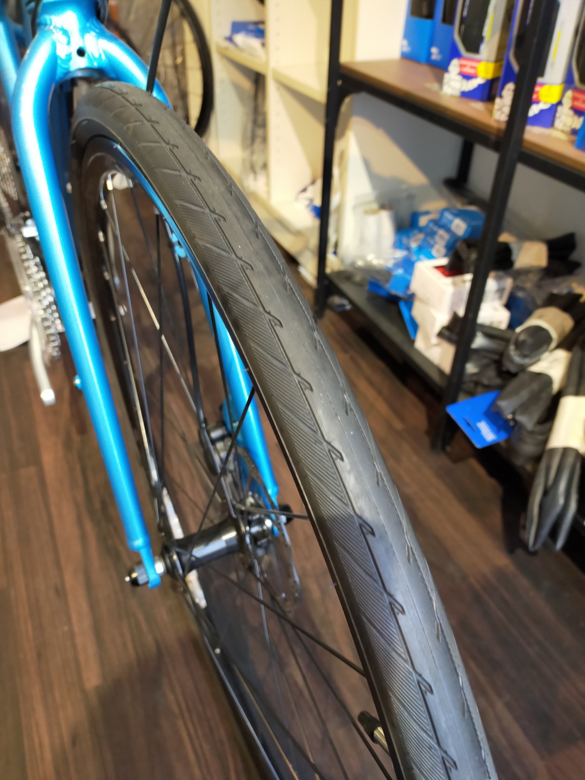 一般的なシティサイクルは37mmほどの太さで、それよりも20%ほど細くなっております。