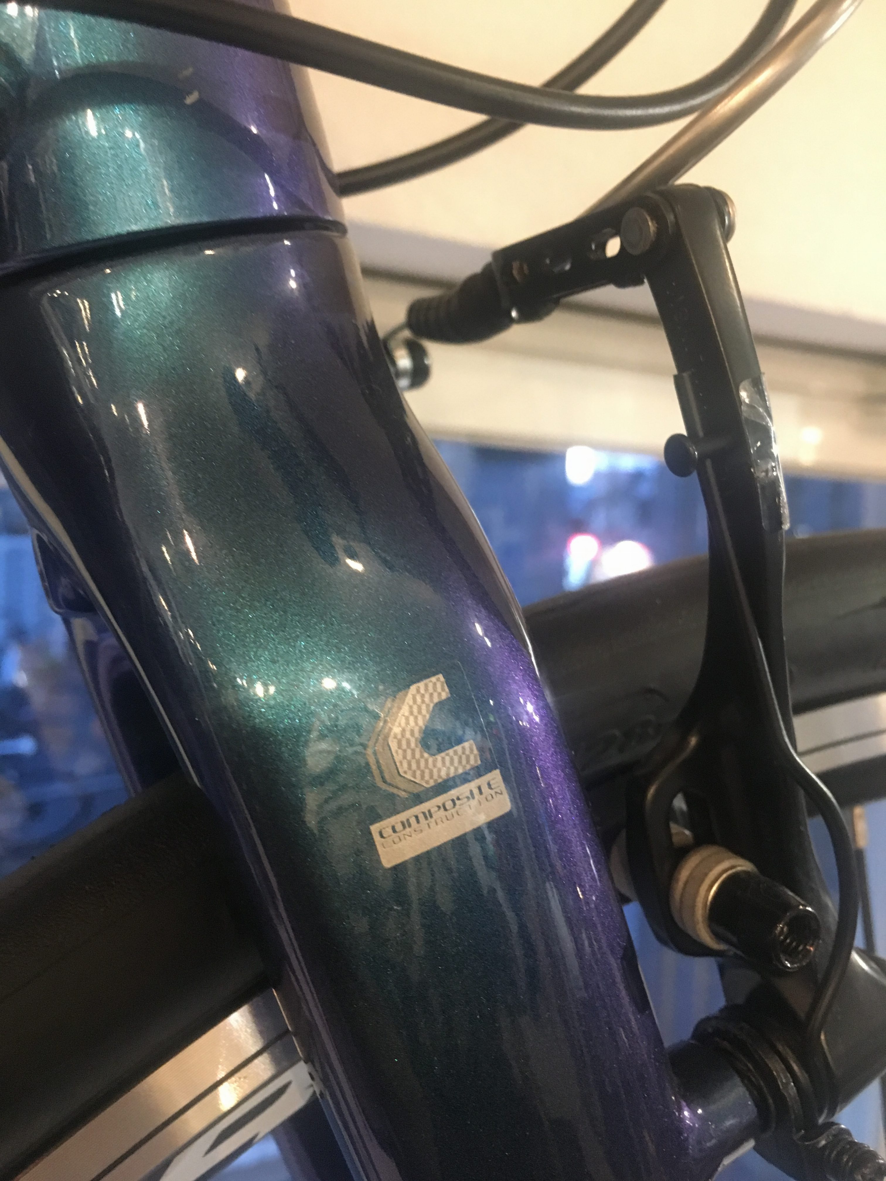 カーボンフォークながら、フェンダー(泥除け)取り付け用のタボ穴が標準装備されています。