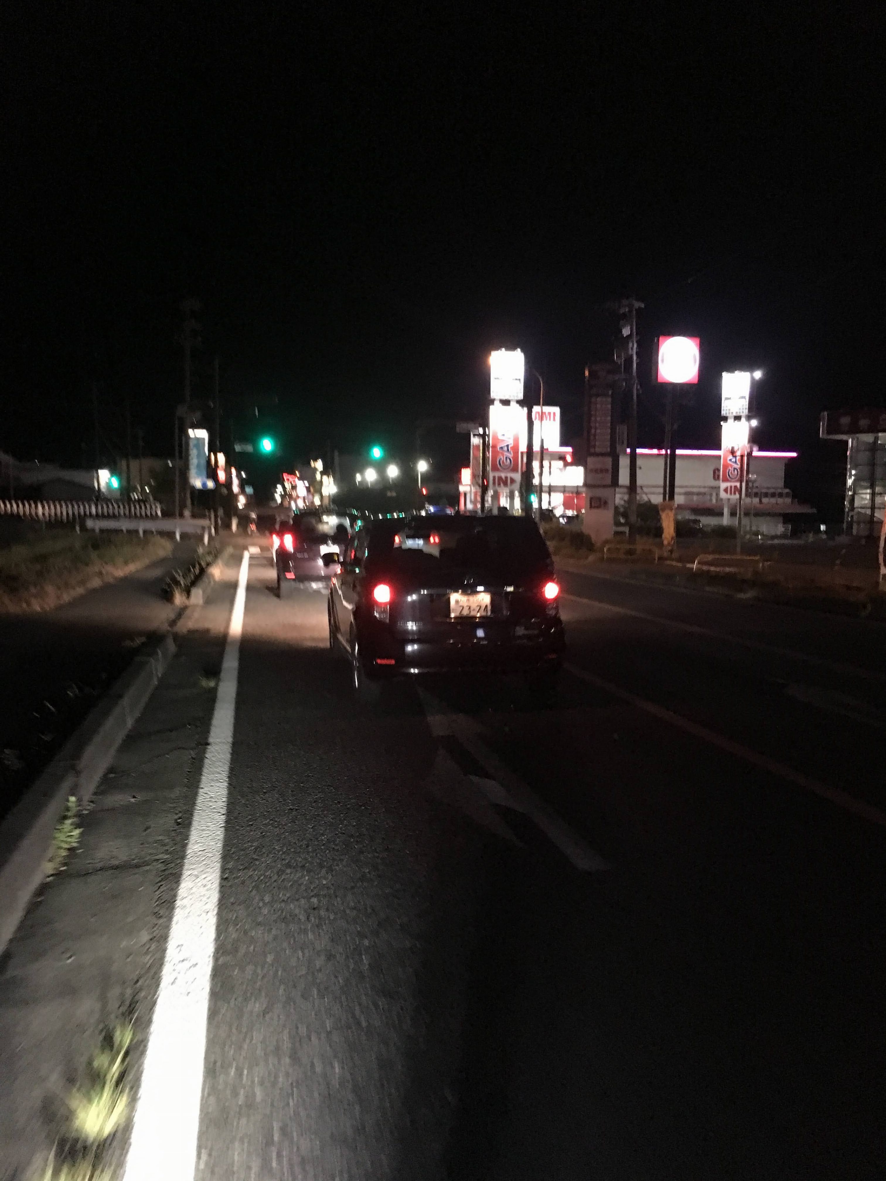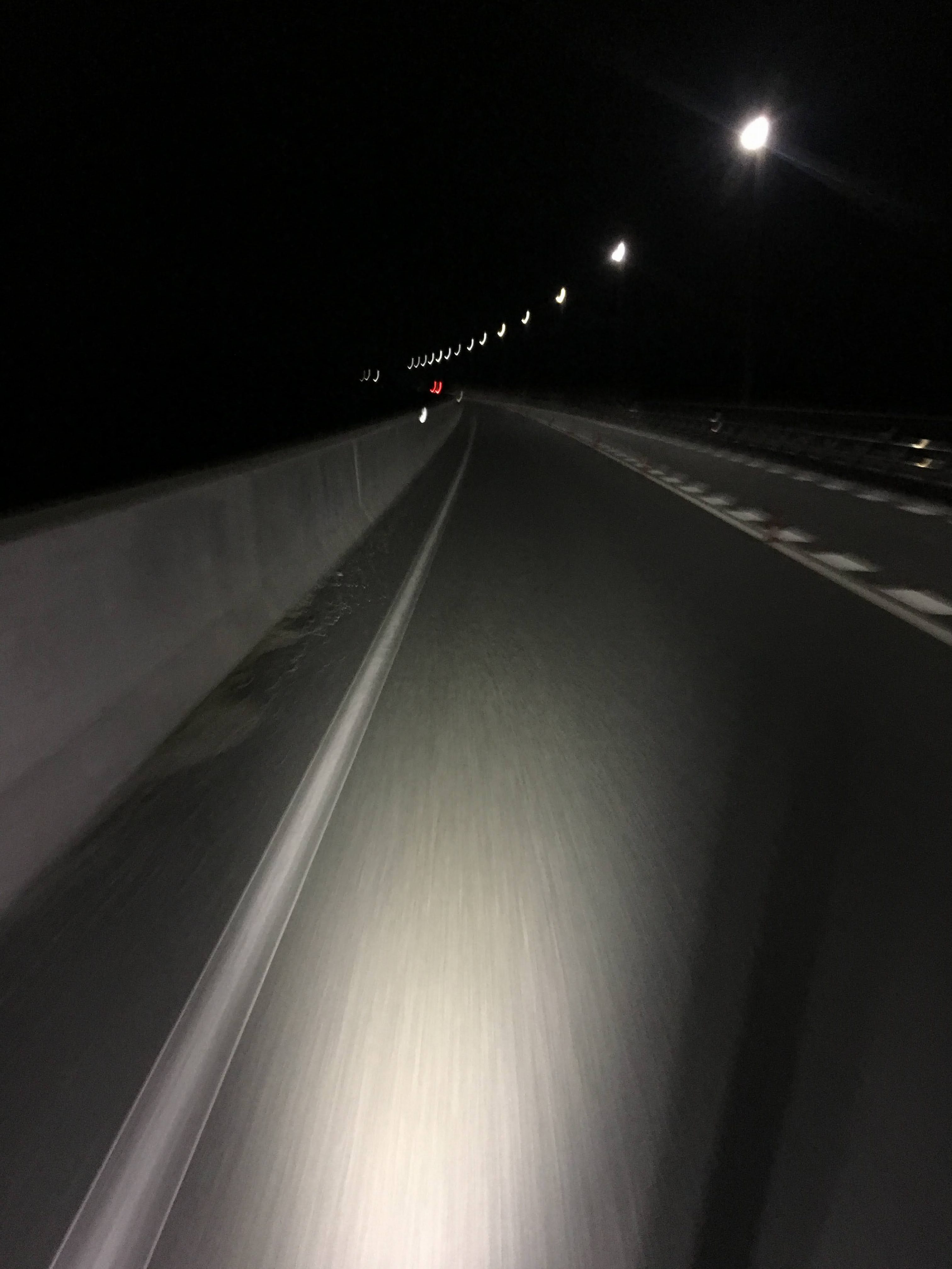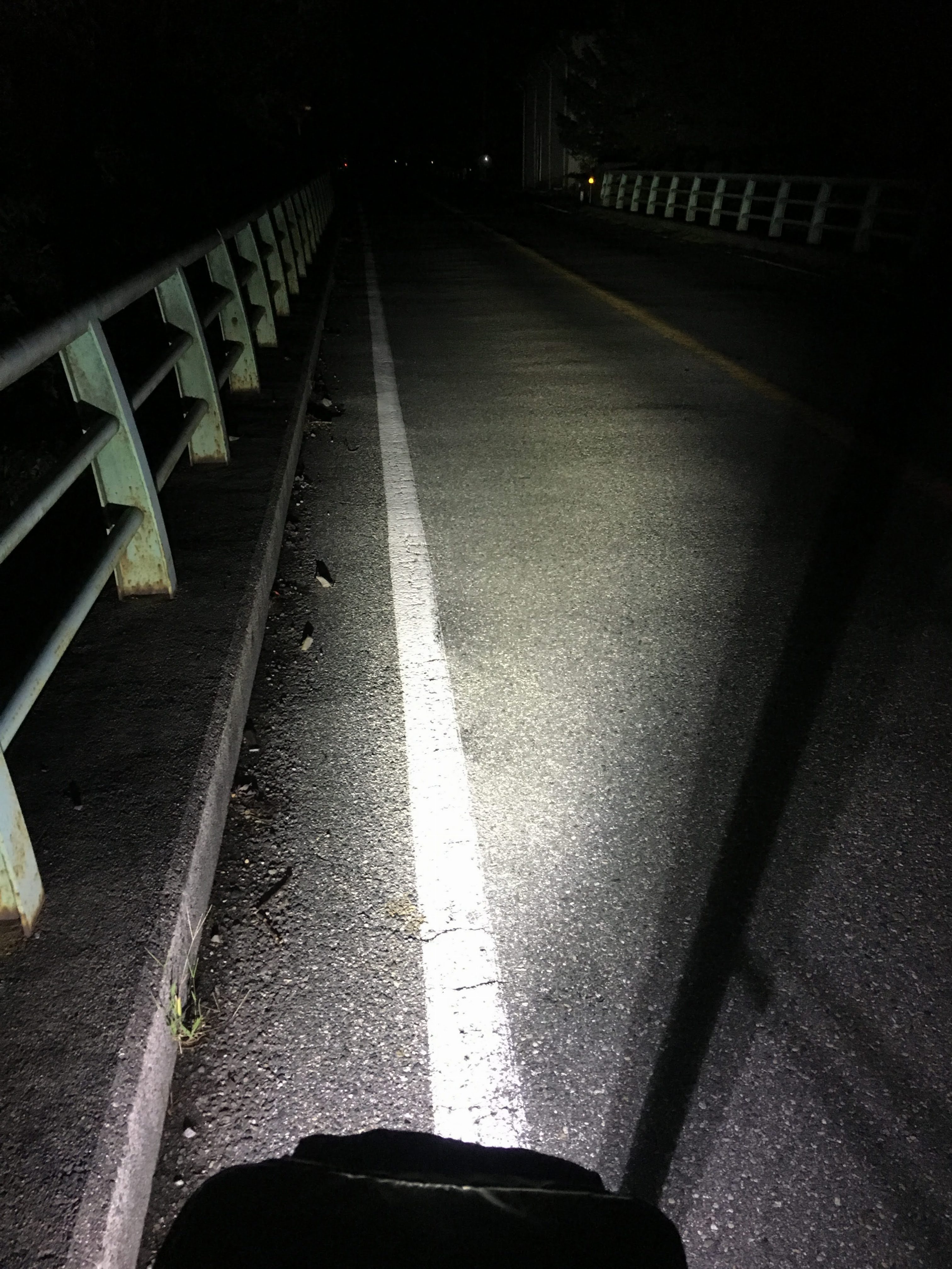 強力なライトにも助けられ、道路の最高速度である時速60km付近を維持したまま(自転車は軽車両で、当然ながら道路交通法の規制対象です。さらに、ブルベでは交通法規の遵守が必須で(当たり前ですが)、交通法規違反は、失格となります)、ぐわんぐわんとダウンヒルをしていきます。