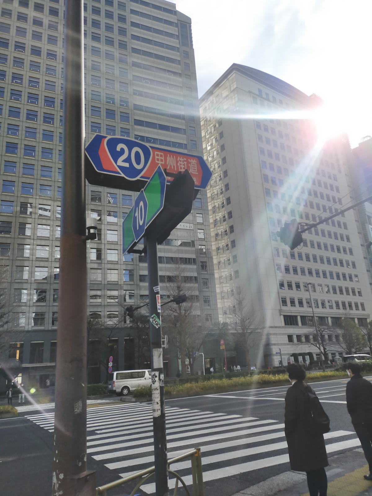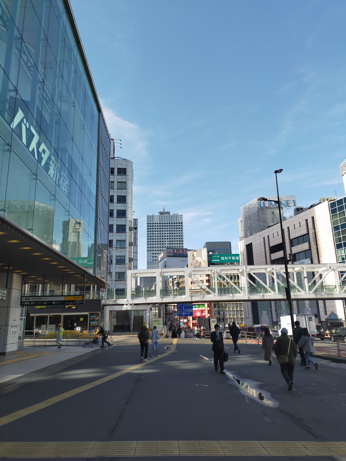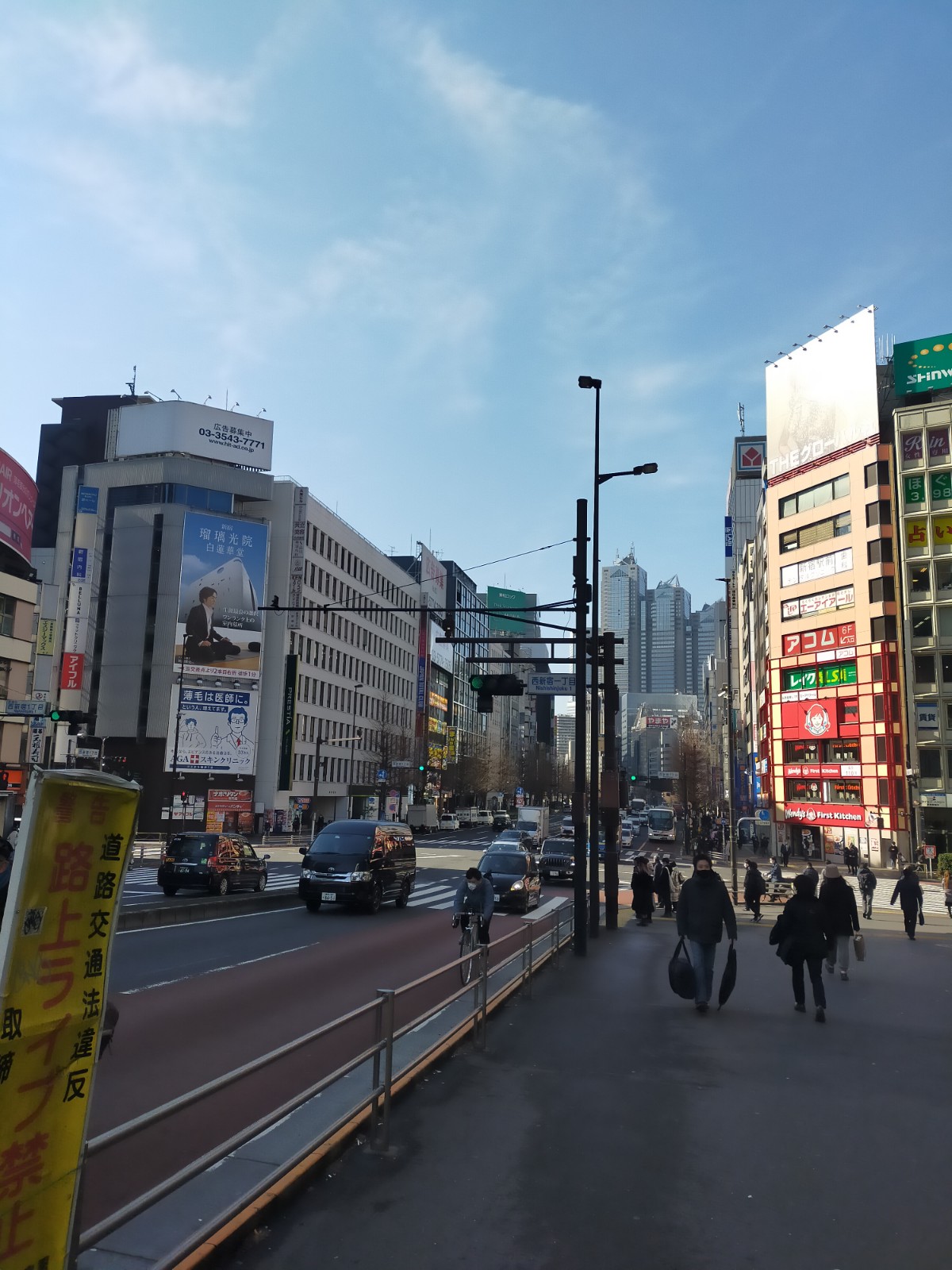 新宿モノリスビル(東側、左手)、新宿NSビル(西側、右手)、KDDIビル(東側、左手)の間を過ぎて、甲州街道に出ます。
