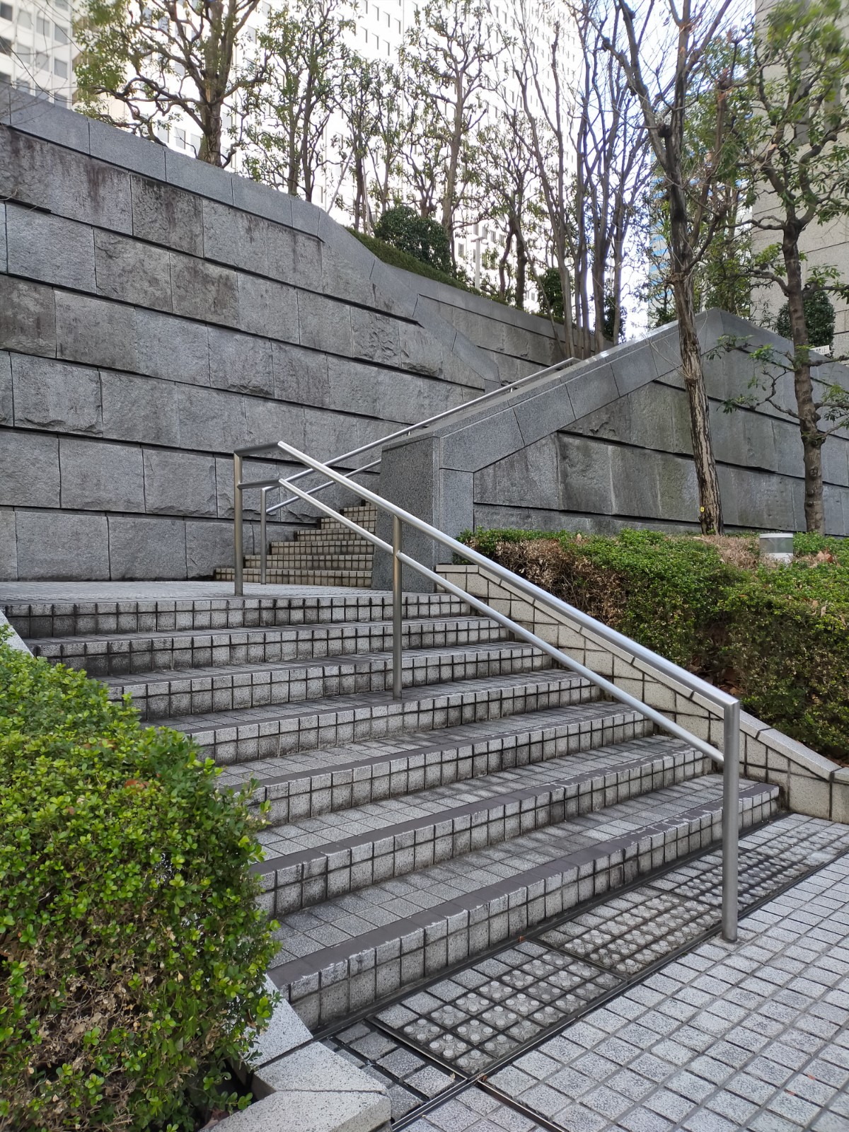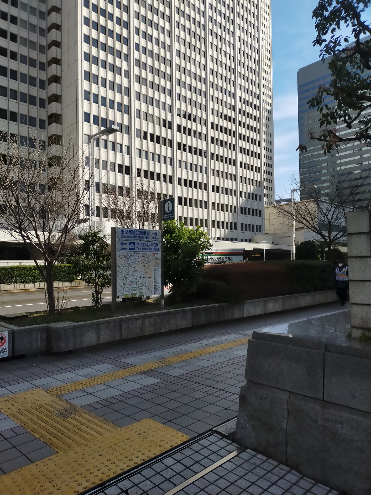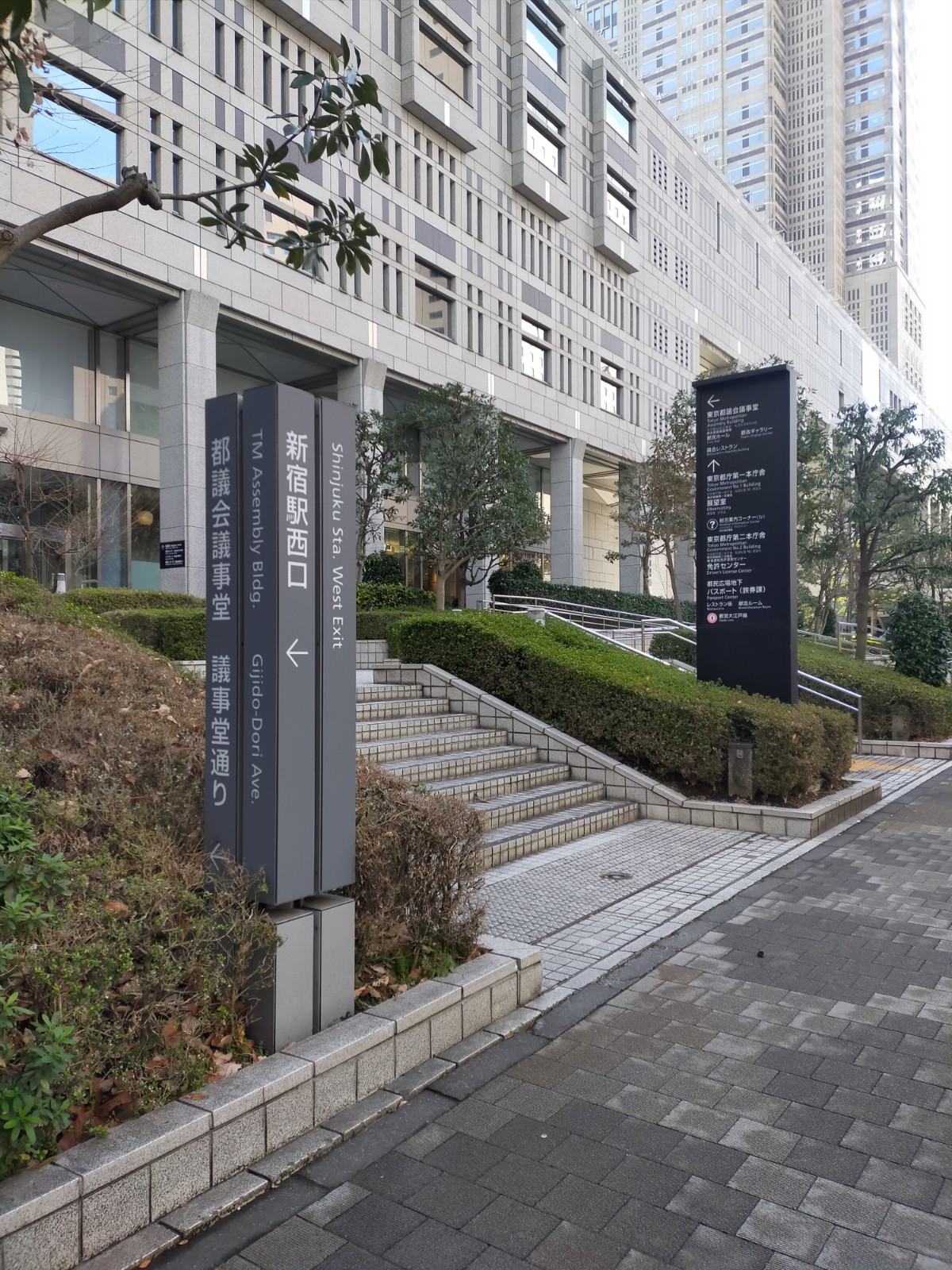 正面(東)に京王プラザホテル(正面の白いビル)、階段を登りきった手前(西)に都庁があります。