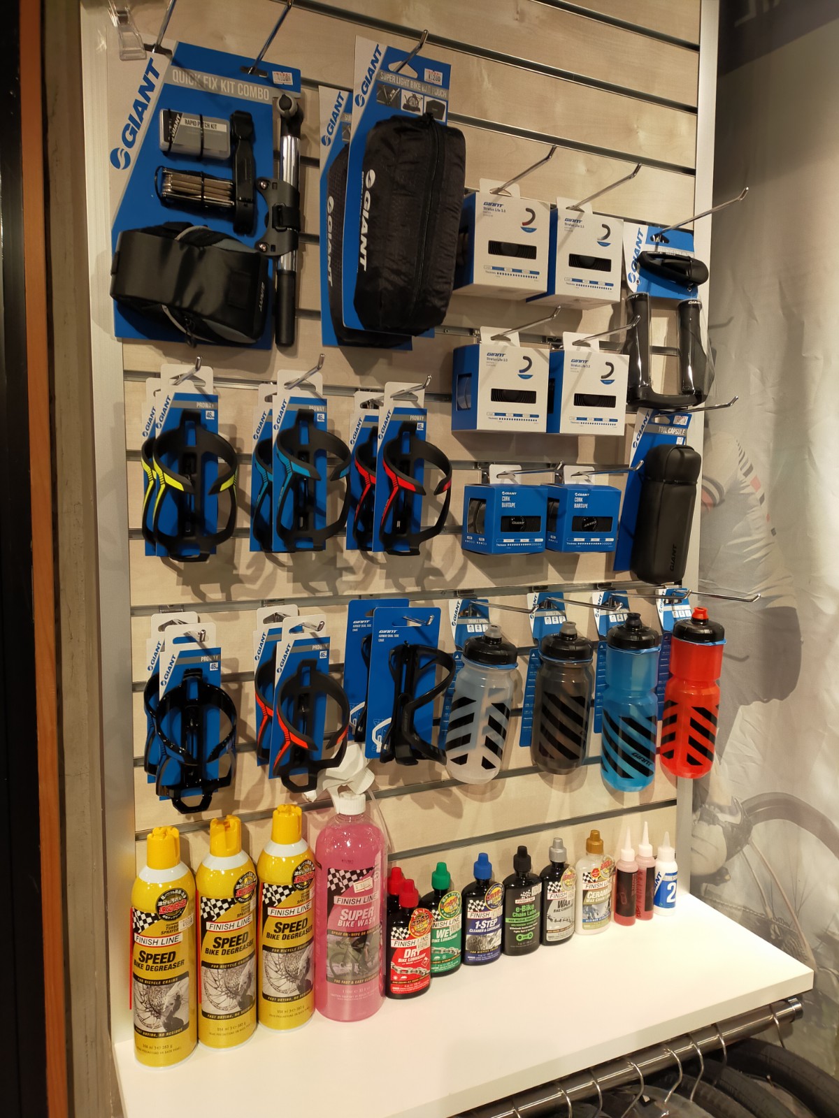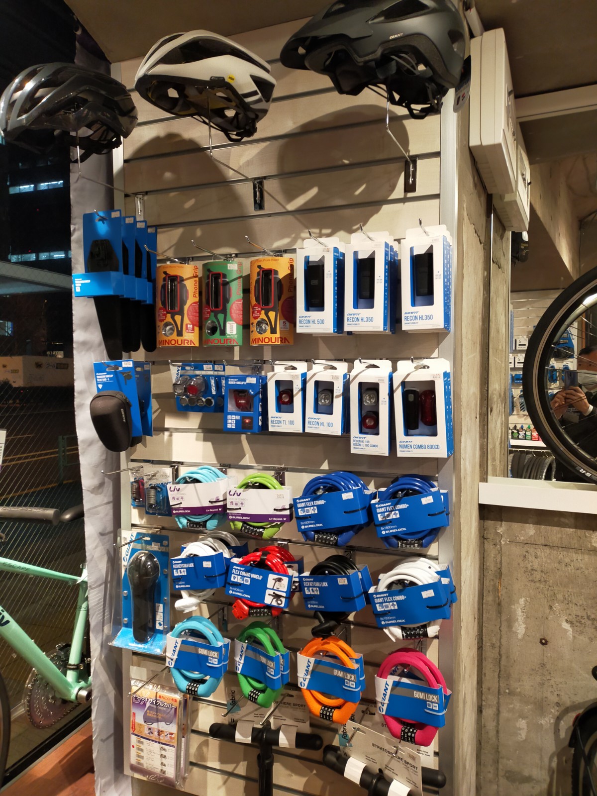 GIANTブランドだけでなく、多様なブランドの用品(ライト、ロック、スタンド、ヘルメット、ウェアなど)販売。
