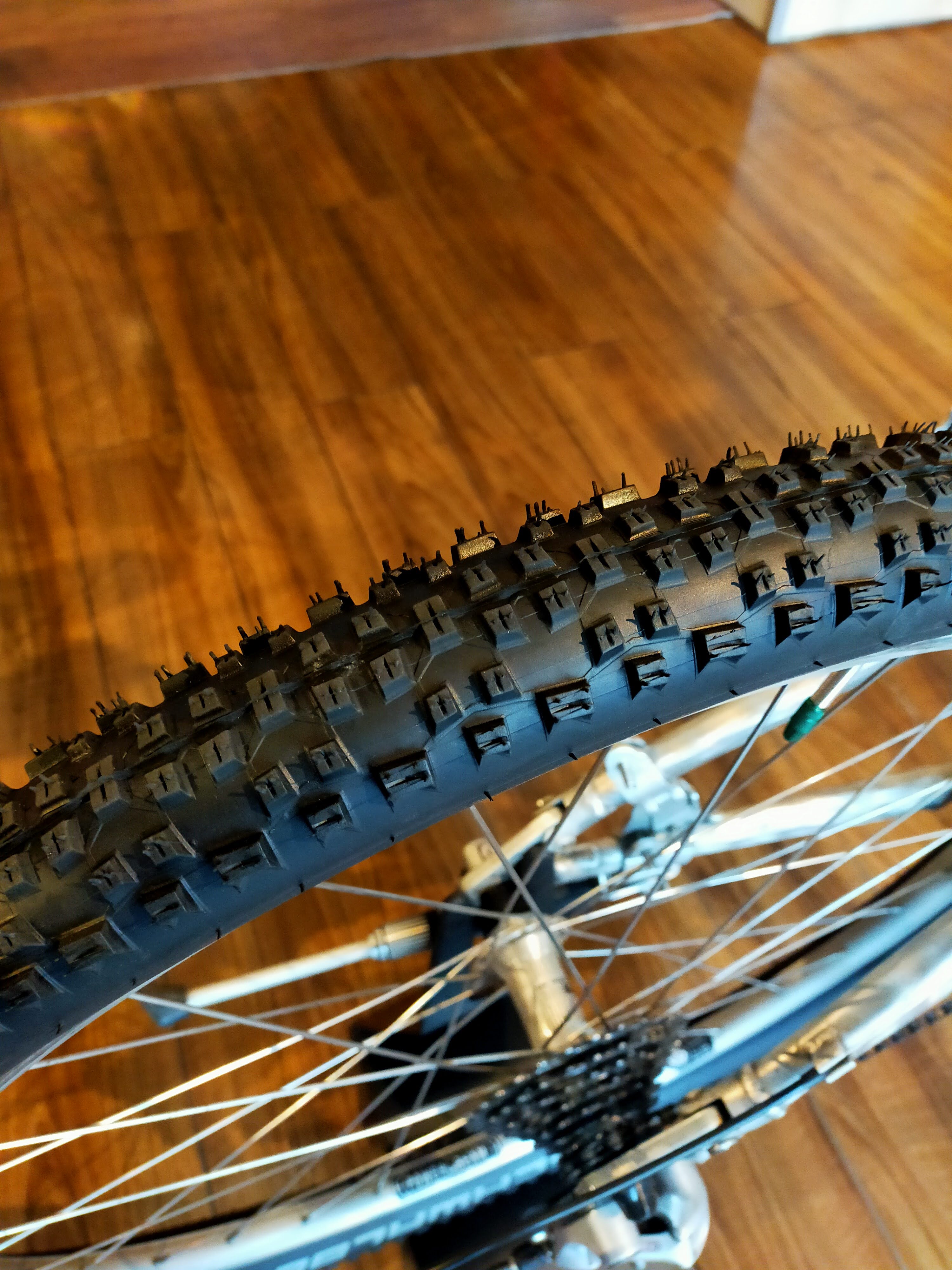 オフロードの雰囲気を残しつつも、ブロックがそれほど高く無く、オンロードでもオフロードでも走ることのできる万能タイヤです。