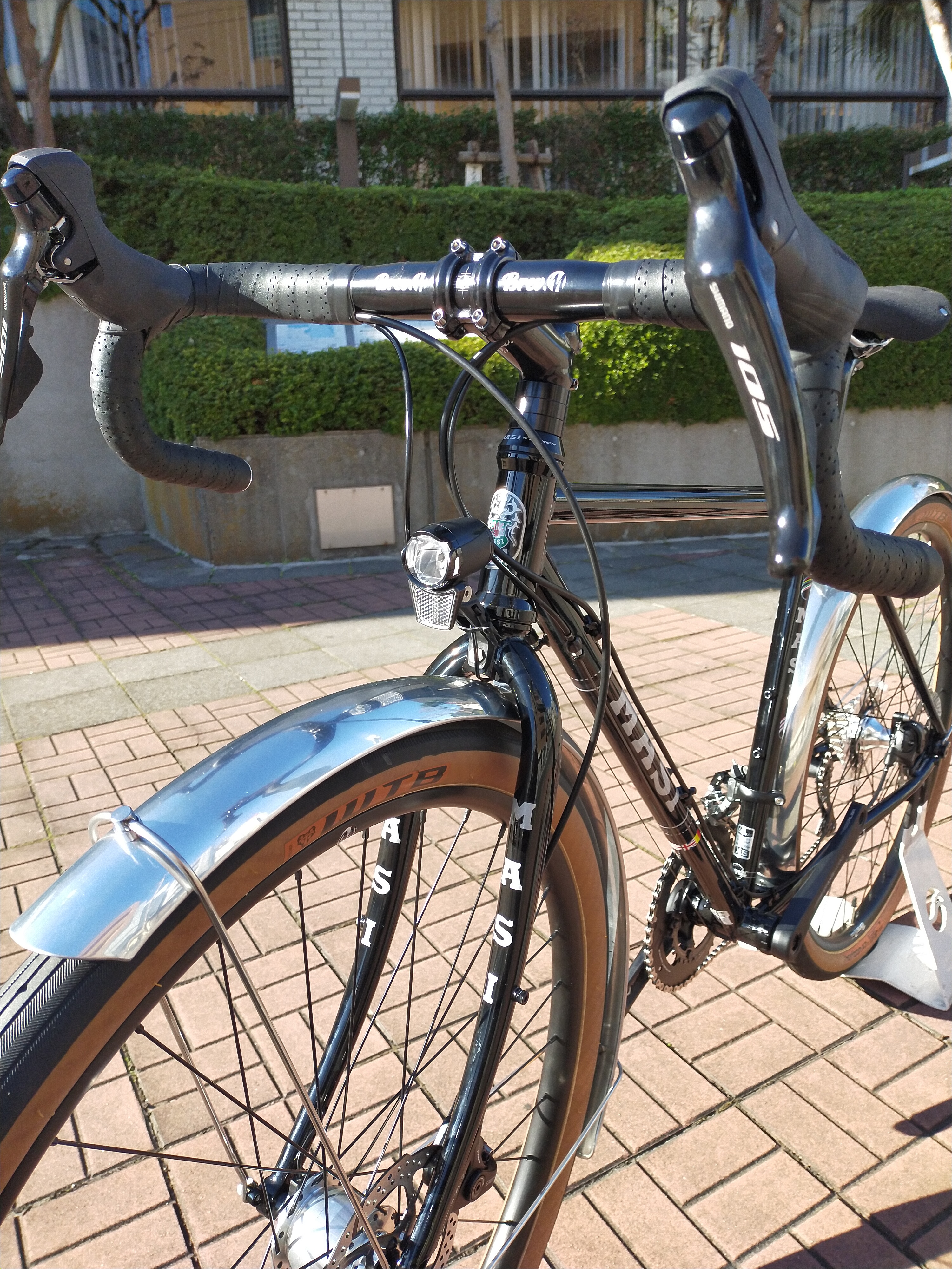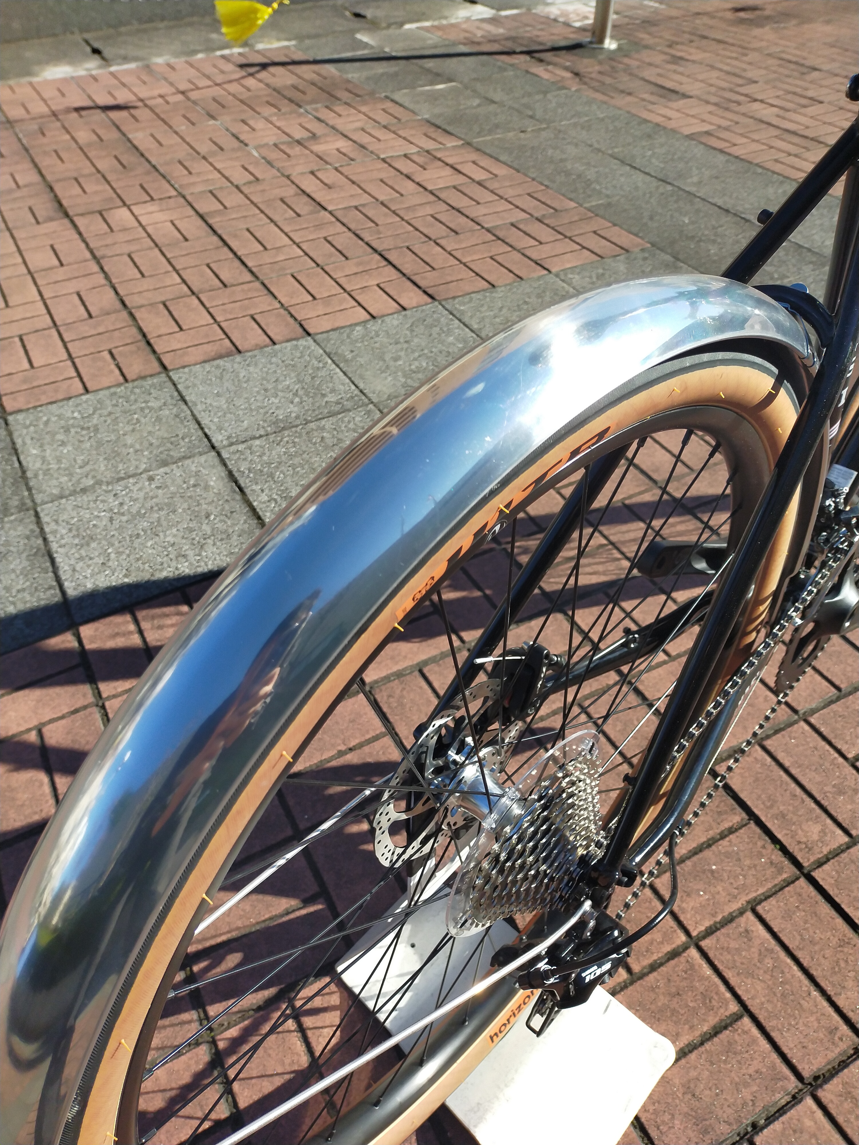 フェンダーが標準装備のロードバイクというだけでも珍しいですが、それがピカピカのシルバーです。