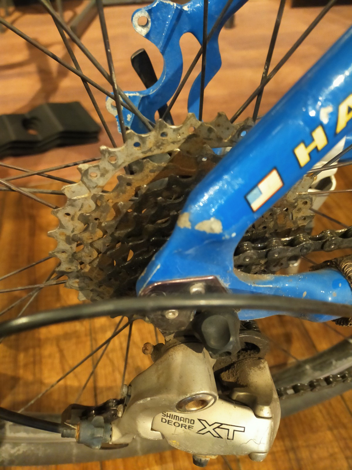 前述しましたように、可能な限り当時のスタイルを再現する、ということで、9速のDEORE XTを装着いたしました。