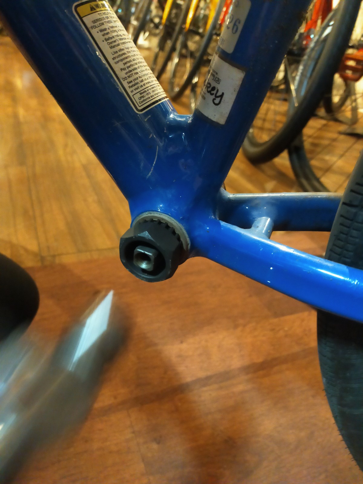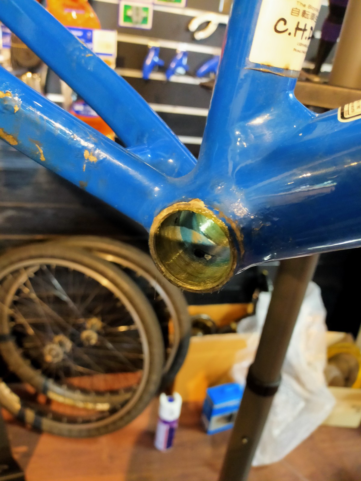 フレームを傷めないように、ハンマーを使って、BB用の工具をはめ込んでいきます。