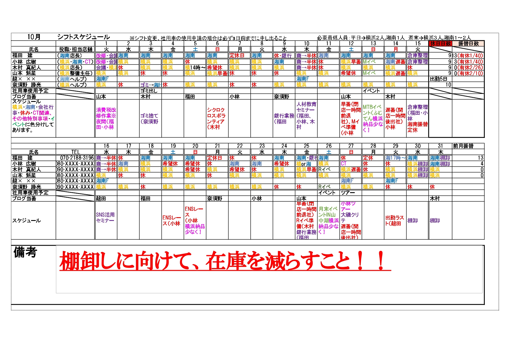写真:弊社シフト表の一例(個人情報は一部消してあります。)