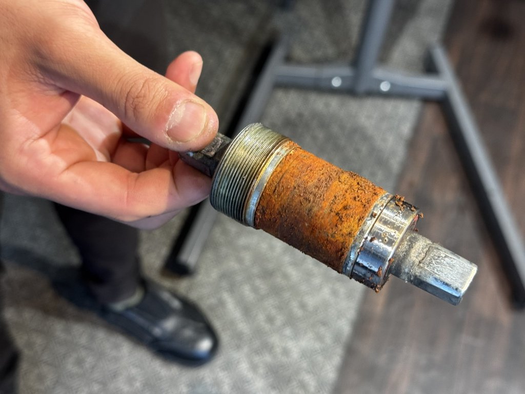 メカニック山本の宝刀、「現場猫外し」。やっと固着したボトムブラケットを外すことに成功しました。ヨシ!