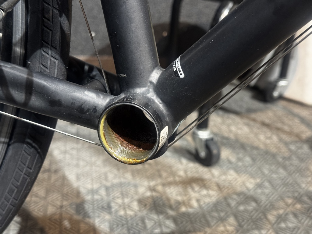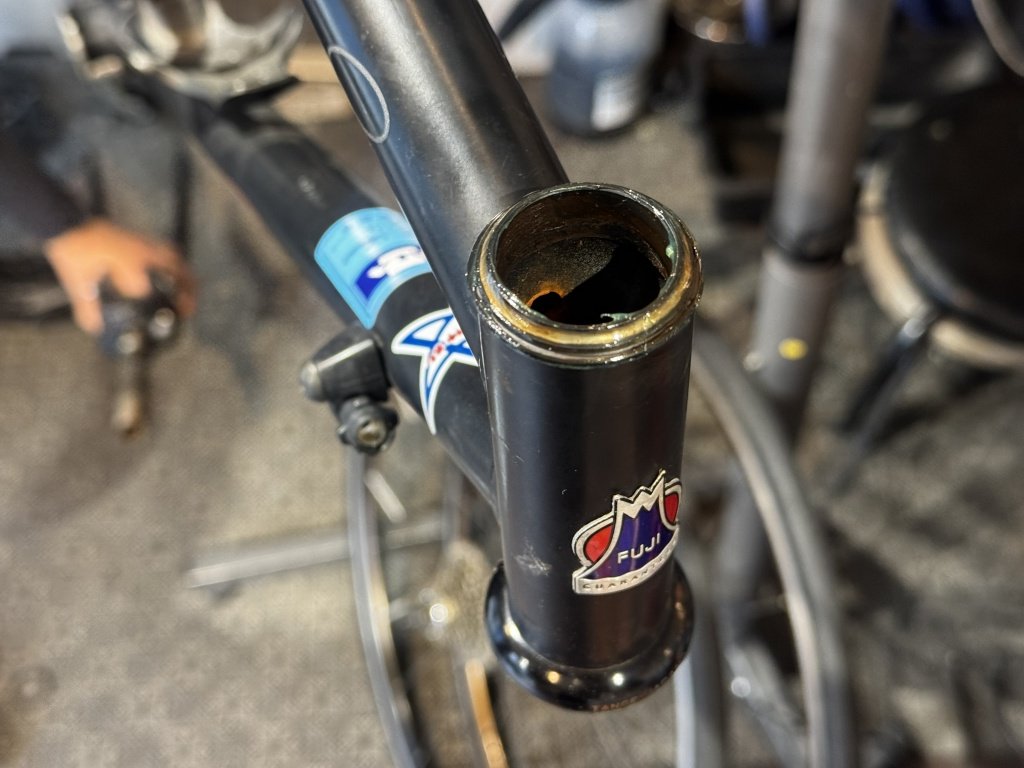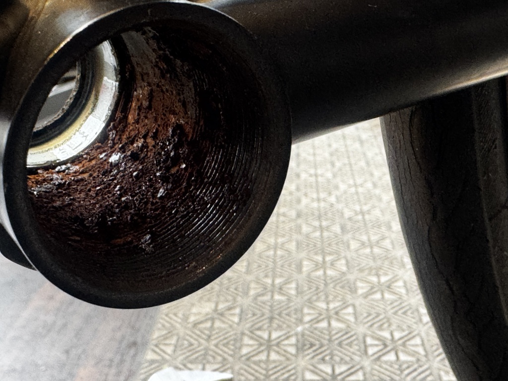 内側はサビがかなり溜まっていました。幸いなことにねじ切りは無事だったので、新しいボトムブラケットは入れられそうです。クリーニングをしてグリスアップしていきます。