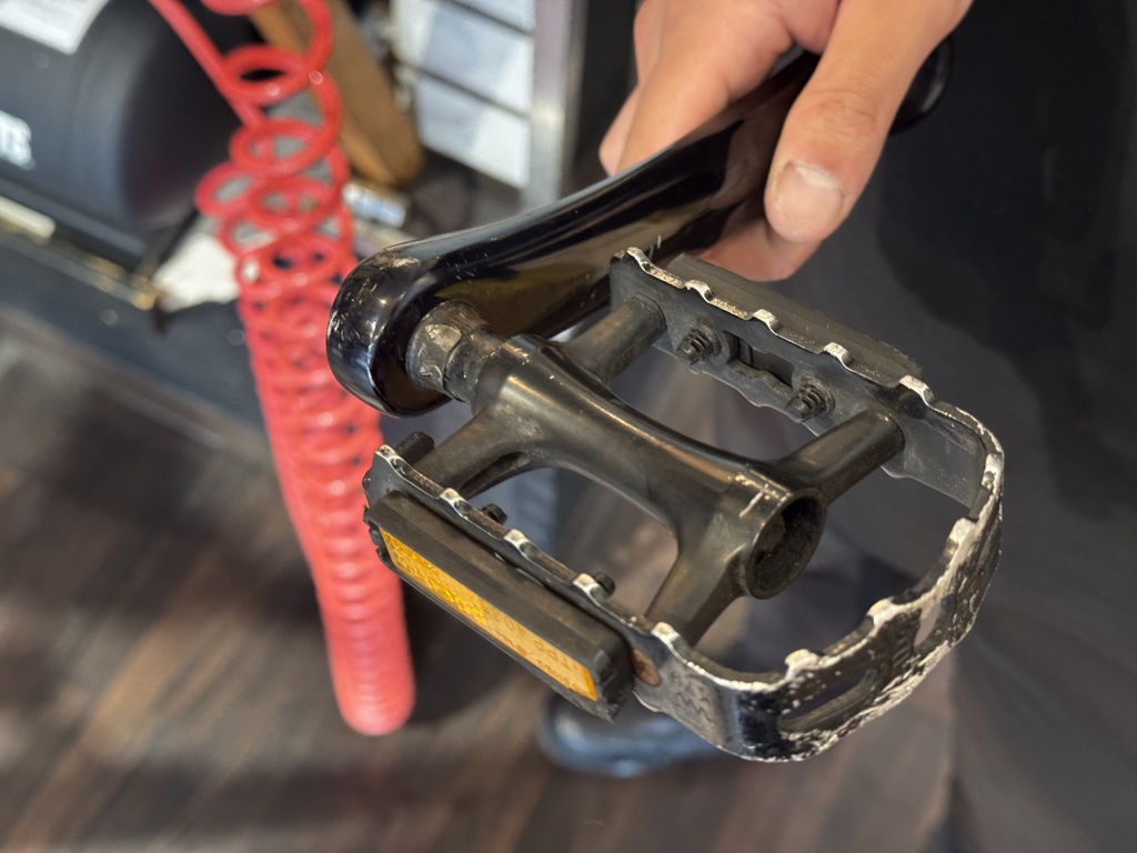 ペダルとクランクは完全に固着しており、無理くり外そうとしたら完全に滑ってしまったような状態です。