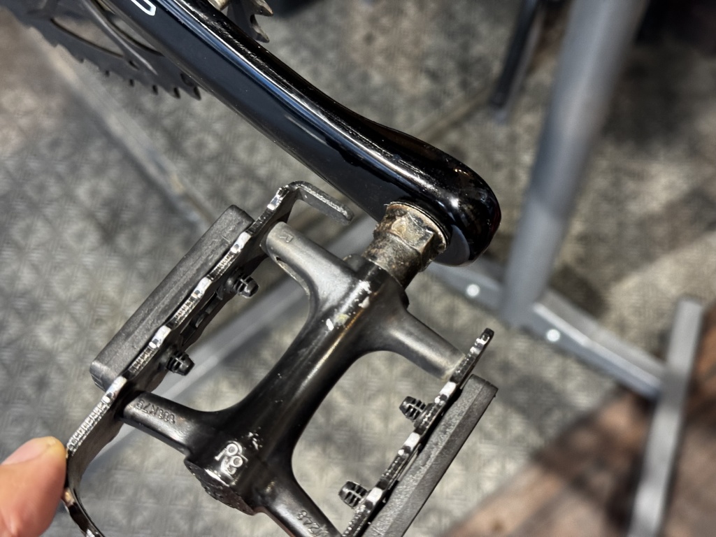 ペダルとクランクは完全に固着しており、無理くり外そうとしたら完全に滑ってしまったような状態です。