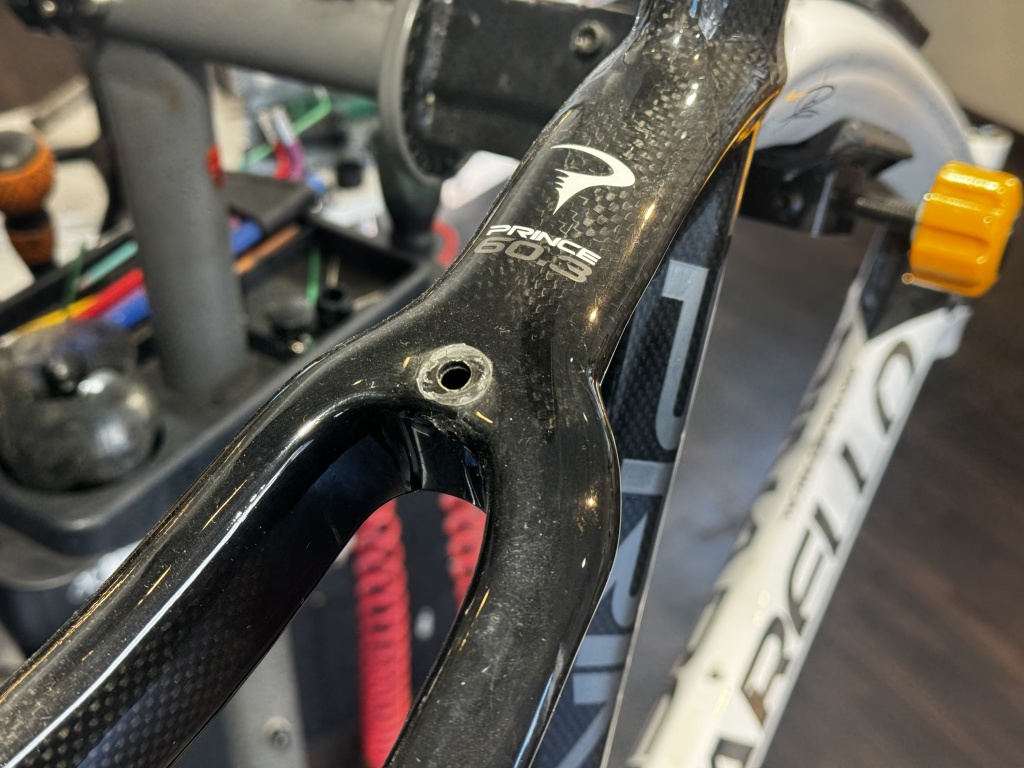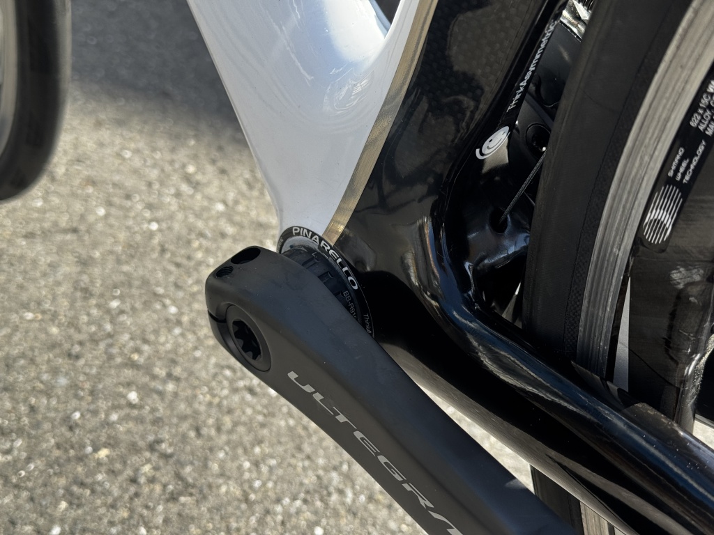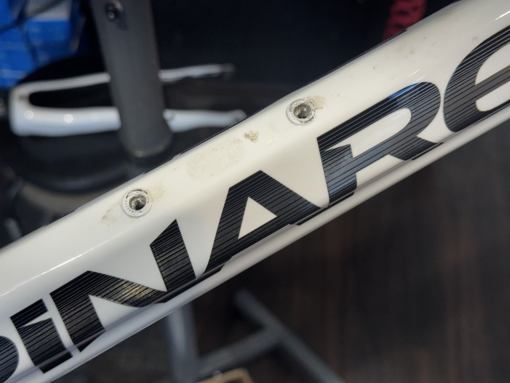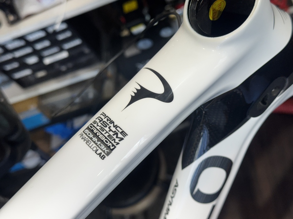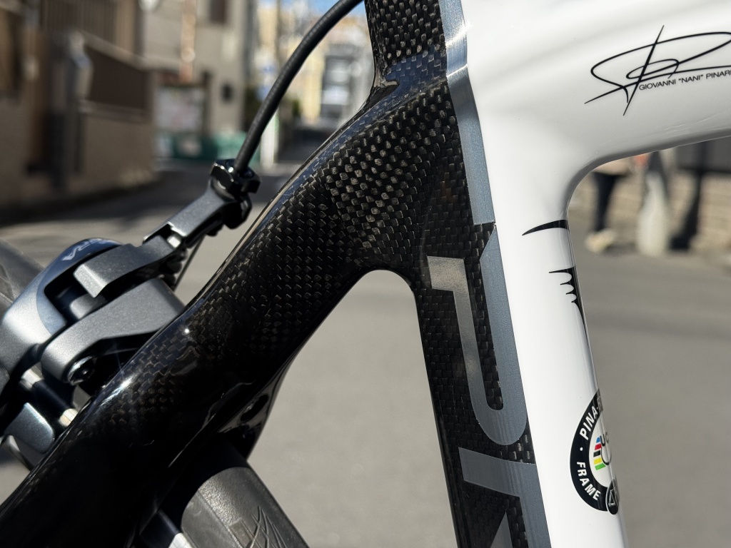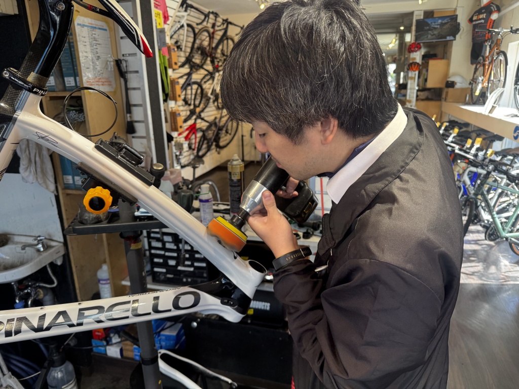 フレームは磨きをかけ、ハドラスコーティングを施工し、ピナレロのフレームの曲線が美しく輝いています。