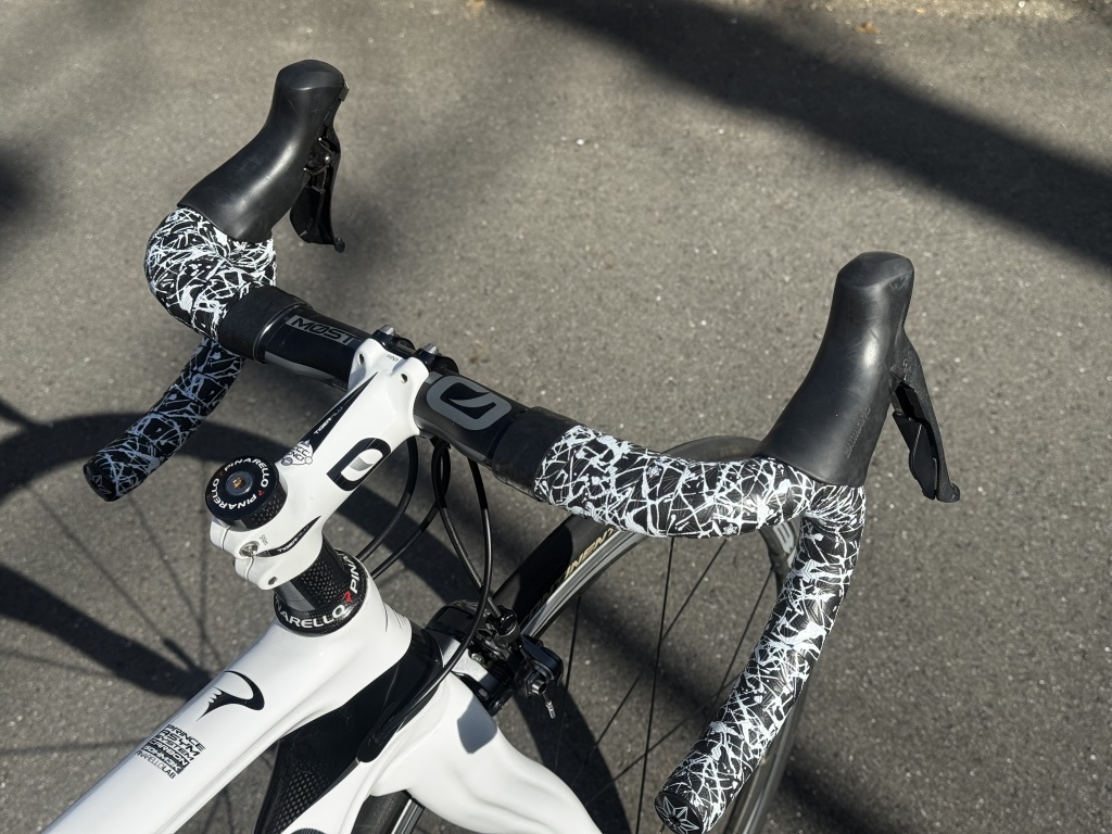 バーテープはスパカズのSTICKY KUSHをチョイス。スプラッターの白と黒がフレームと相まった仕上がりになりました。