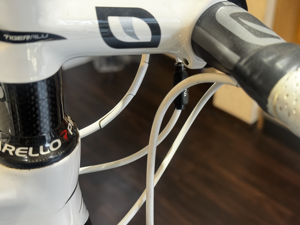 ワイヤー交換していきます。交換前のワイヤーはフロントとリアの変速ワイヤーがクロスして、変速時にお互いに干渉している状態でした。