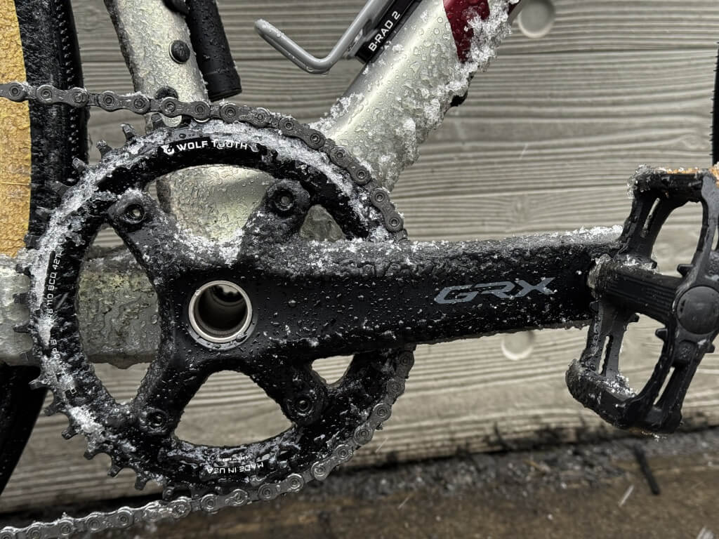 クランクはGRX。40Tから42Tに変更し、もう少し速く走れるように変更したそうです。グラベル登り区間をガッツリ走ることがなければ、こっちのほうが良いとのこと。