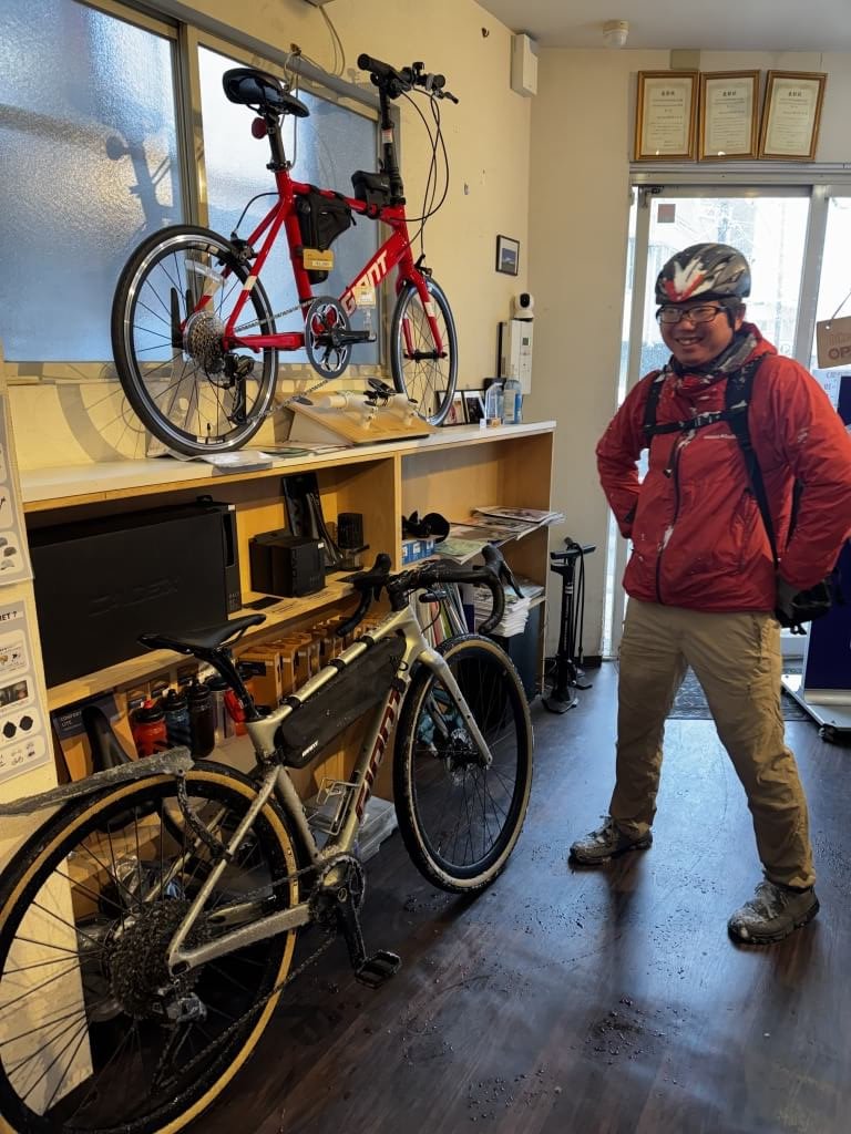 フレームバッグは完全防水ですが、山本自身は雪にまみれて震えて出勤していました。