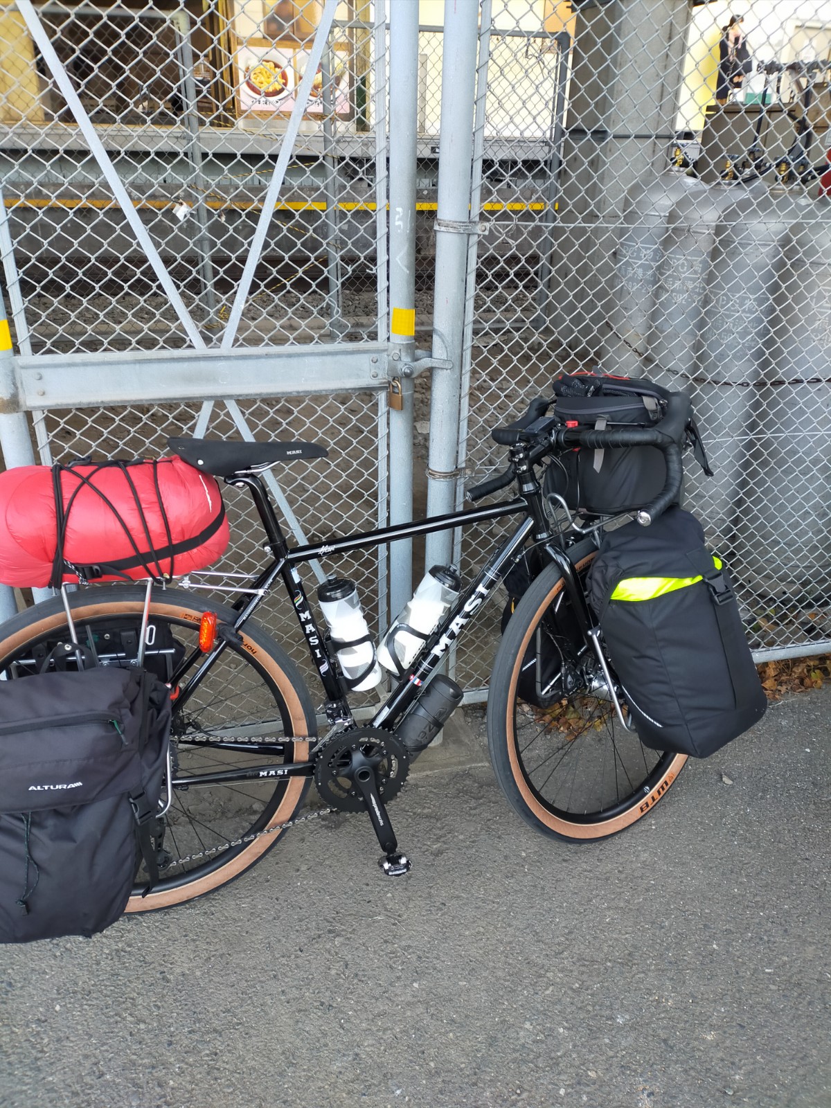 膨大な量になるため、フロントバッグに加えて、フロント、リアキャリアの両脇にサイドバッグを装着します。