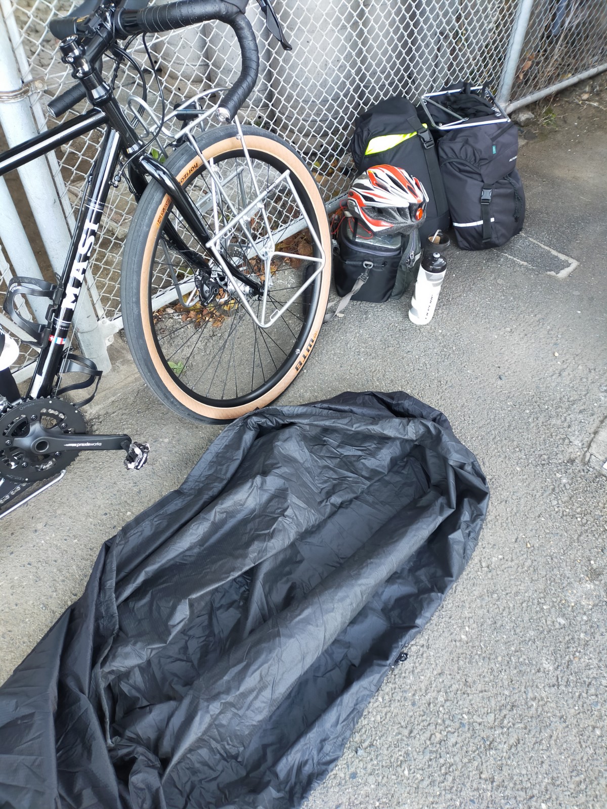 サイドバッグ、リアキャリアに積んである寝袋を外して、輪行袋に詰めます。
