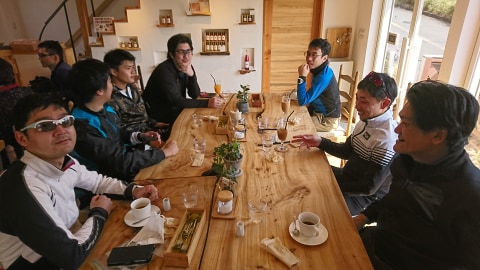 一息つきながら、ヒルクライム講座開設。「ヒルクライムにとって大事なことは、『気合い』です!!」とても役立つ情報をお伝えしました。