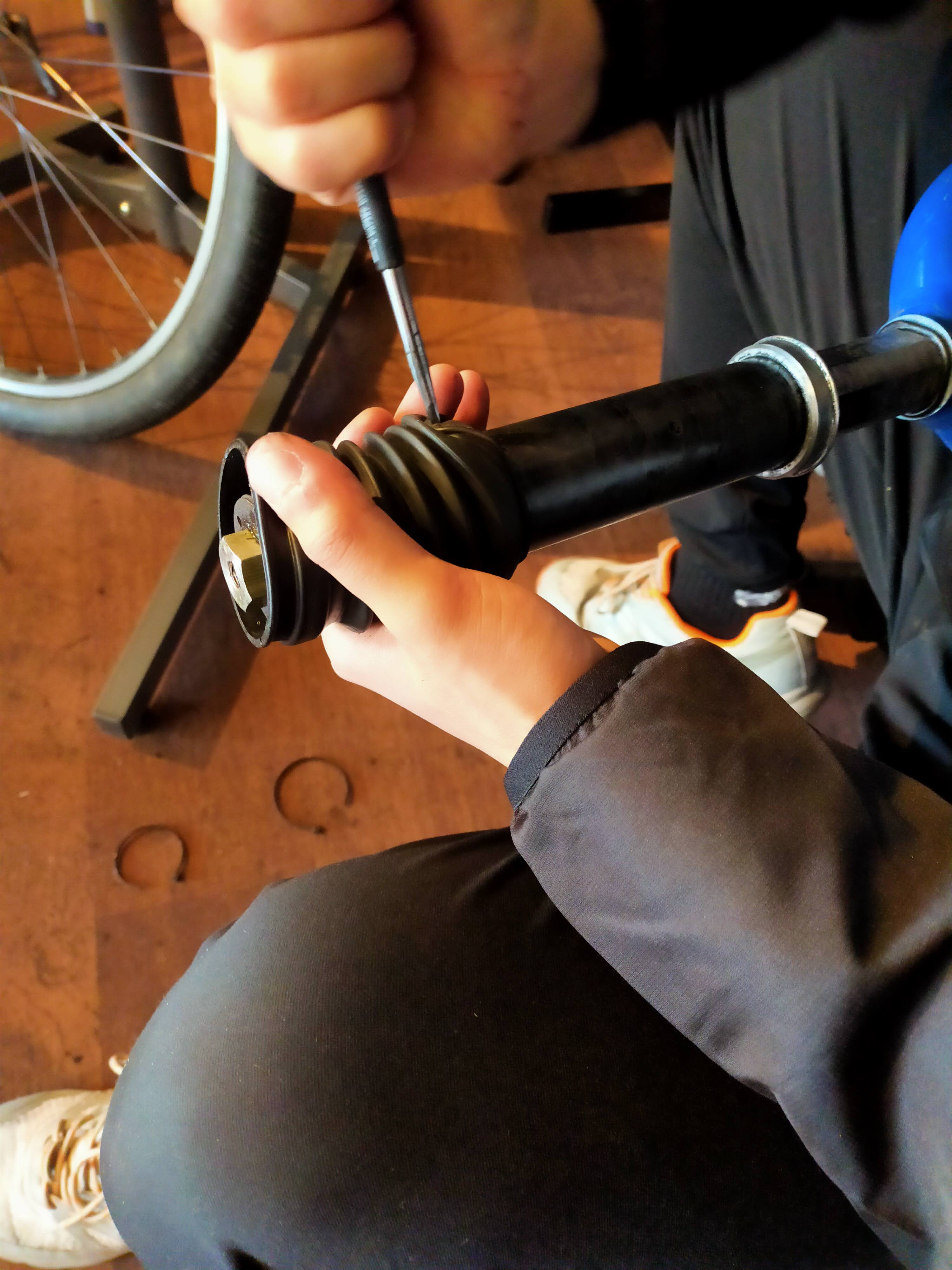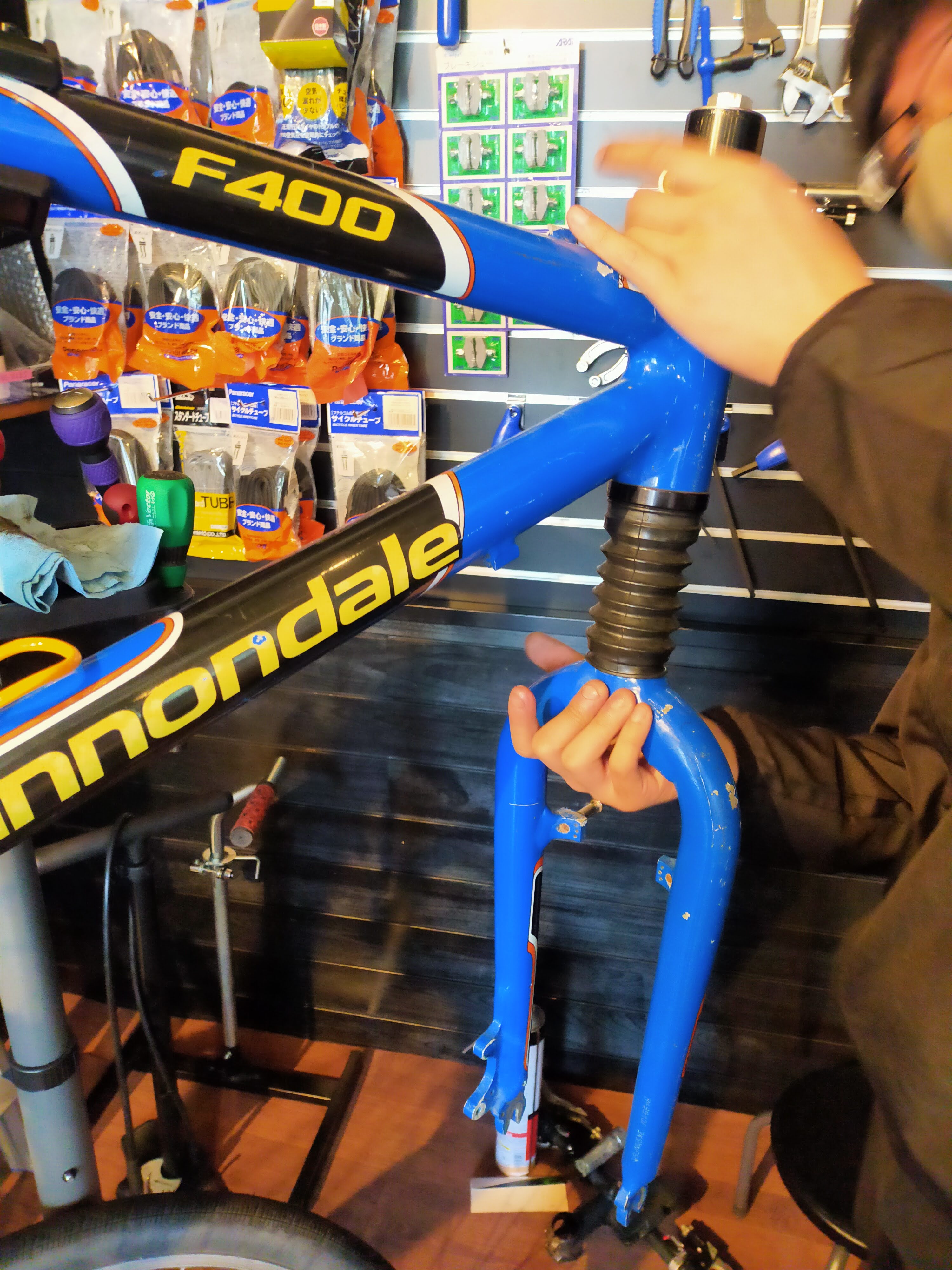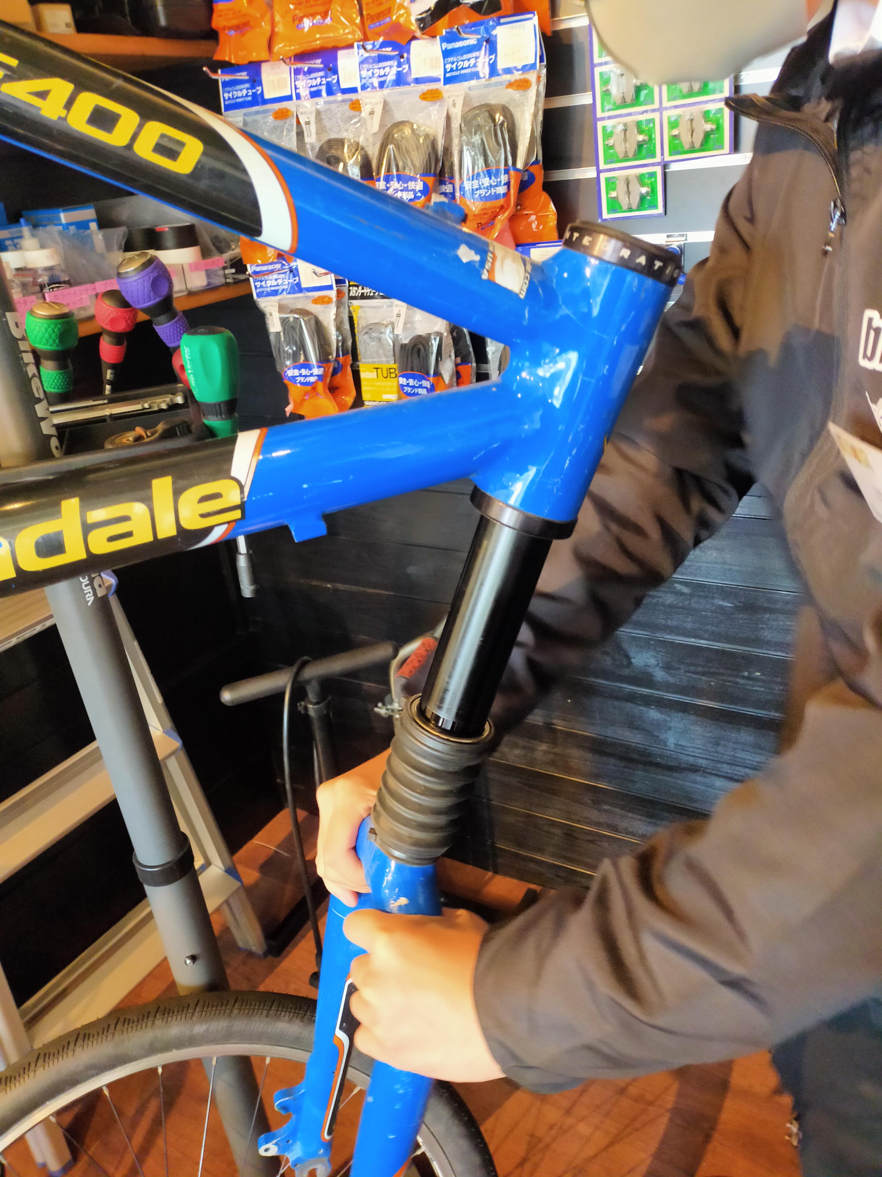 お持込み頂いたバイクは、20年近く前のモデルで、ヘッドショック(Cannondale独自の機構で、フロントサスペンションの一種)の動きが非常に渋くなっておりました。