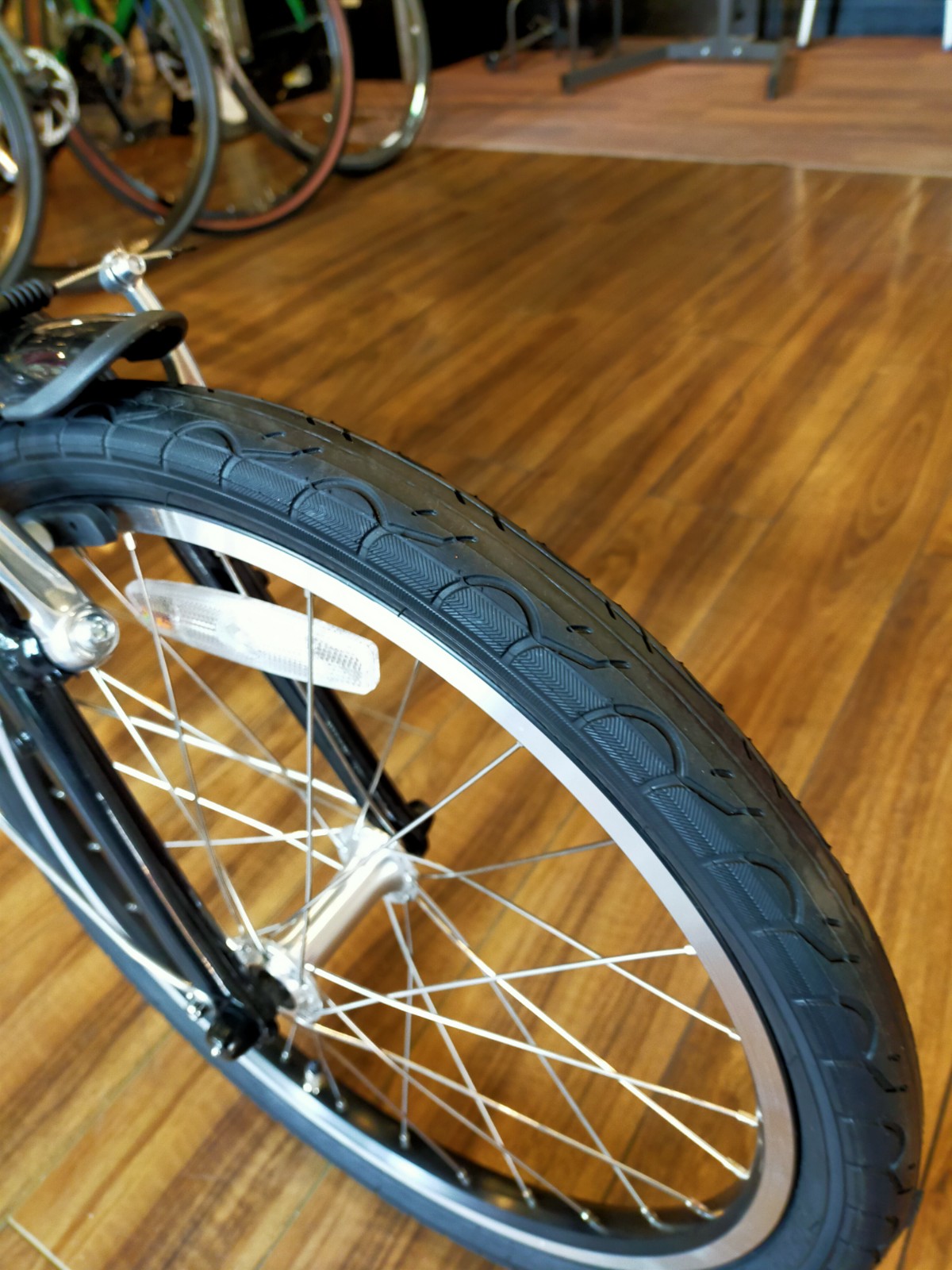 一般的なシティサイクルで採用されている、26インチ 1 3/8タイヤが37mmほどの太さですから、TENはシティサイクルよりも太いタイヤを履いているのです。