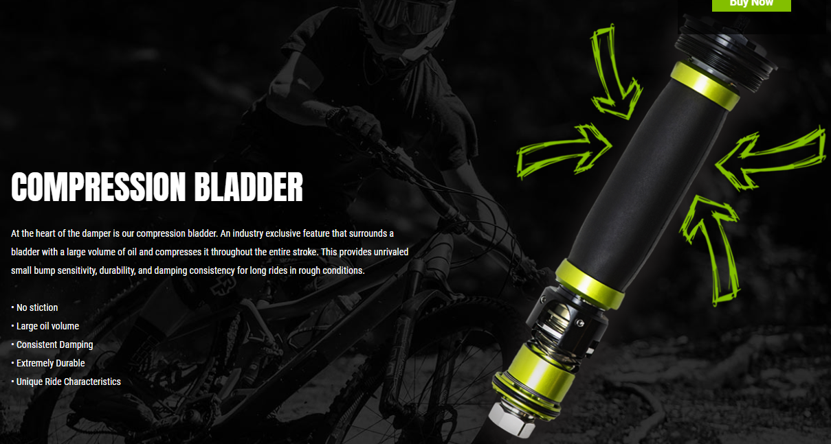 ダンパー(ブラダー)内部に充填されたオイル量を制御することにより、サスペンションの動きを細かく設定することが可能ですが、長時間のストロークさせていると、通常はオイル内に気泡や熱(熱ダレ)が生まれやすく性能が低下します。ダンパー自体はサスペンションに加わった作用(バネが縮む際に生じる反動)をいち早く減衰させる機構のこと。