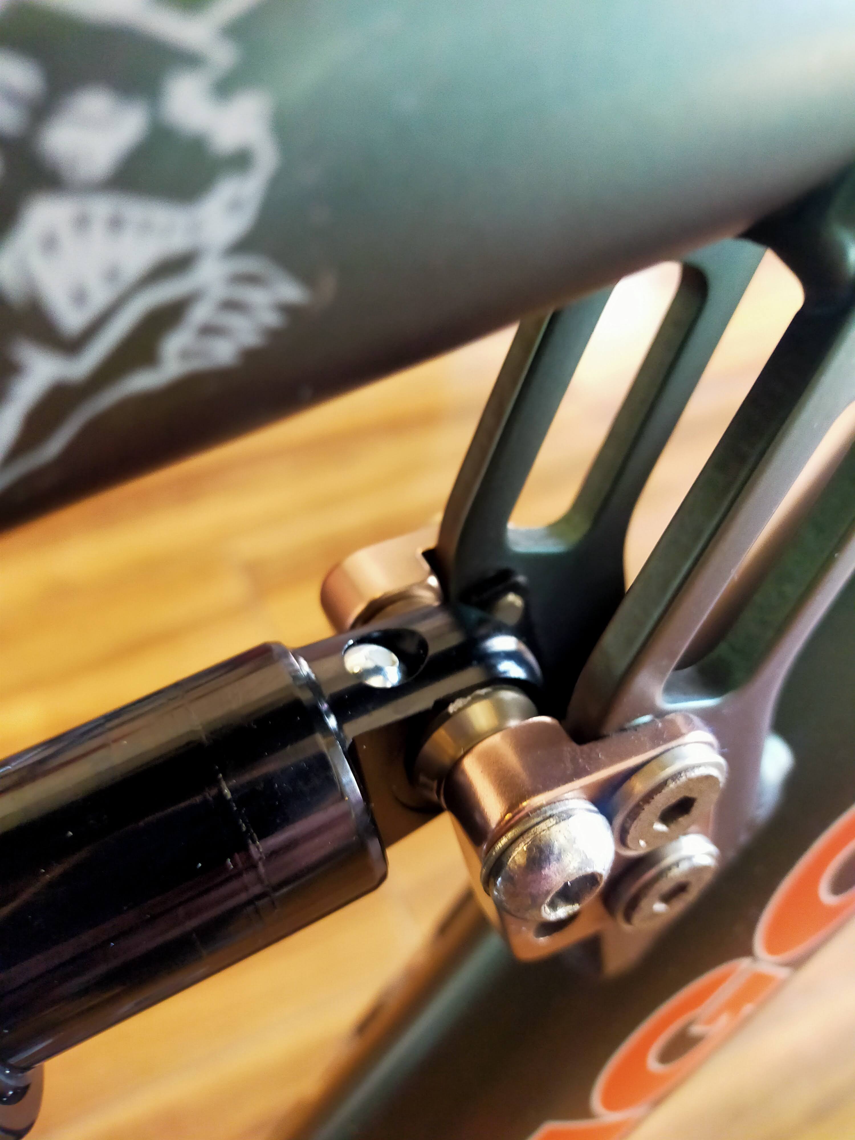 リアショックの取り付けには、リアショックとフレームの隙間を埋める、リデューサーというパーツが必要で、現行の車体、リアショックであれば互換性があるのですが、今回はビンテージバイクということもあり、リデューサーの厚みが完全に一致するものがありませんでした。